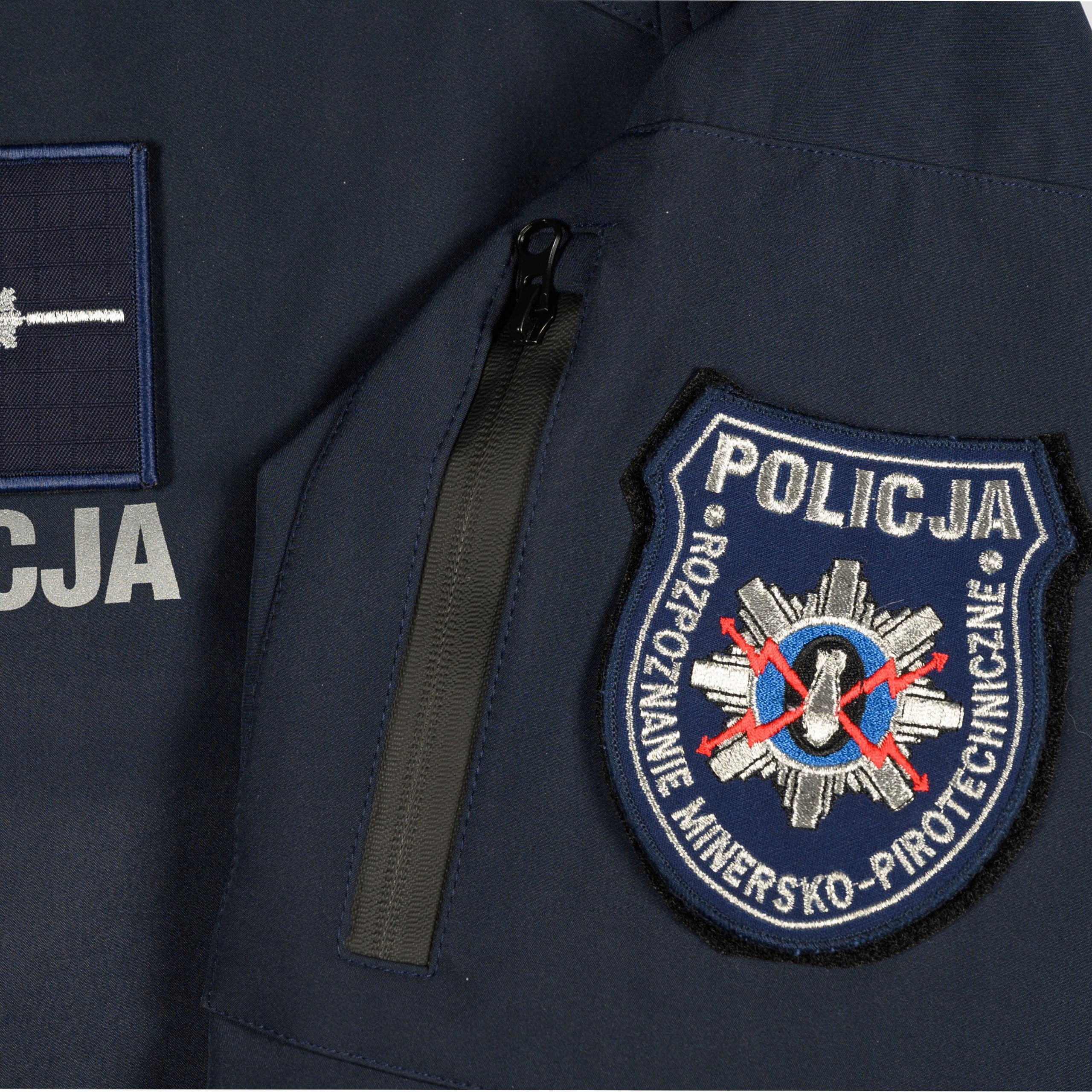 На задней части куртки и в левой верхней части передней части куртки есть отражающая надпись «полиция» в отражающем серебристом цвете, чтобы обеспечить максимальную степень видимости офицера. Надписи выполняются методом катания в материале, что делает их чрезвычайно долговечными.