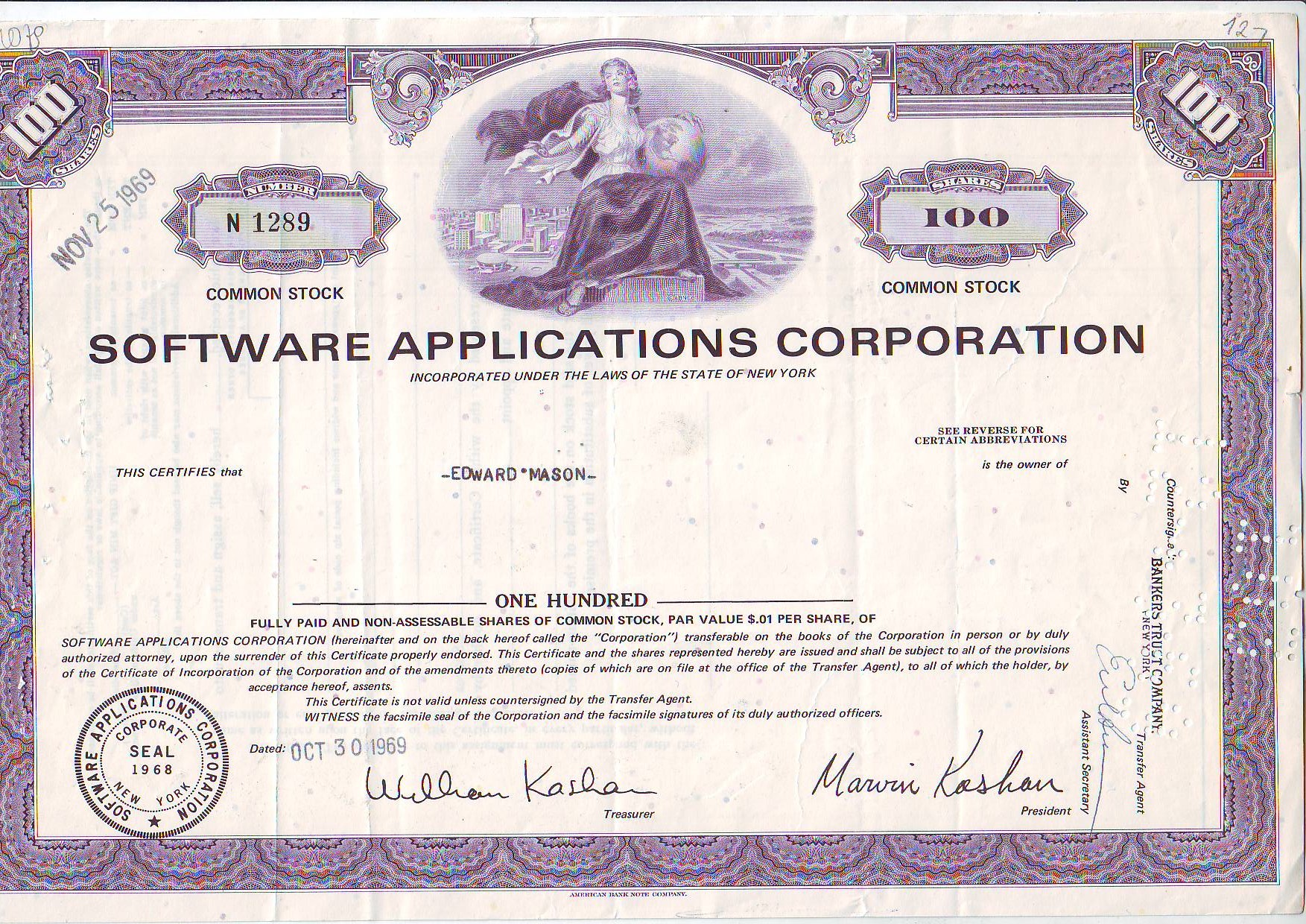 Software Applications Corporation, 100 акций в одной, 1969 г.