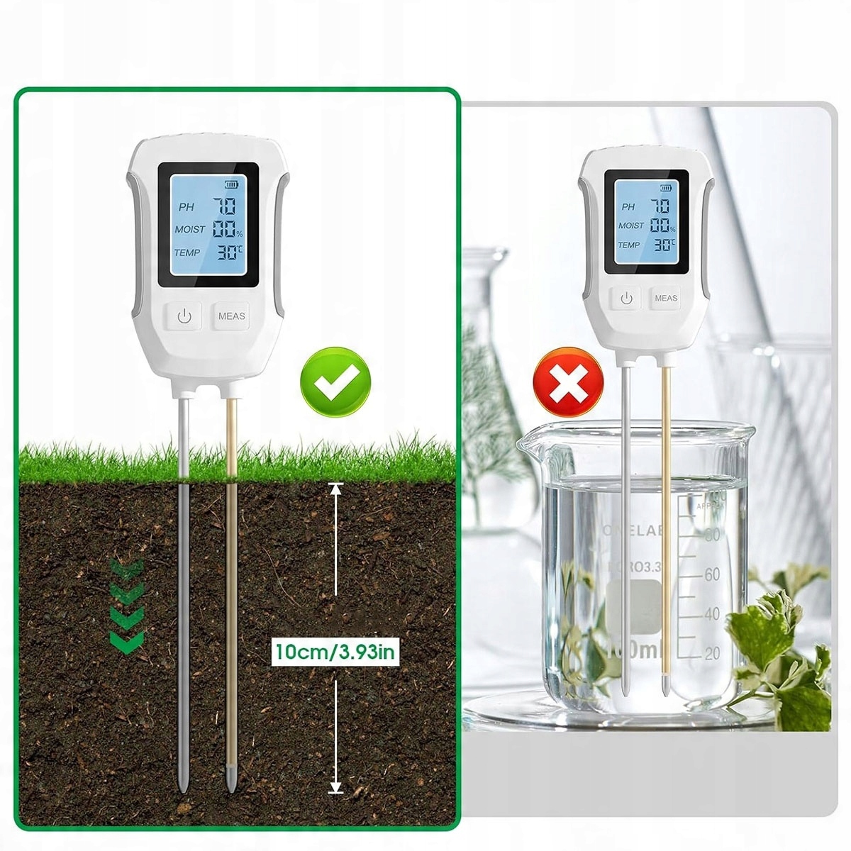 【Измеритель влажности почвы 3-в-1 — влажность, pH, температура】Влагомер почвы обеспечивает точные измерения pH, влажности и температуры почвы. Просто вставьте зонд из набора физики почвы примерно на 5-10 см в почву и нажмите кнопку «Измерить». Данные считываются мгновенно – подключи и работай! ЖК-дисплей с подсветкой обеспечивает отличную видимость как днем, так и ночью и хорошо работает даже в изменяющихся условиях освещения.