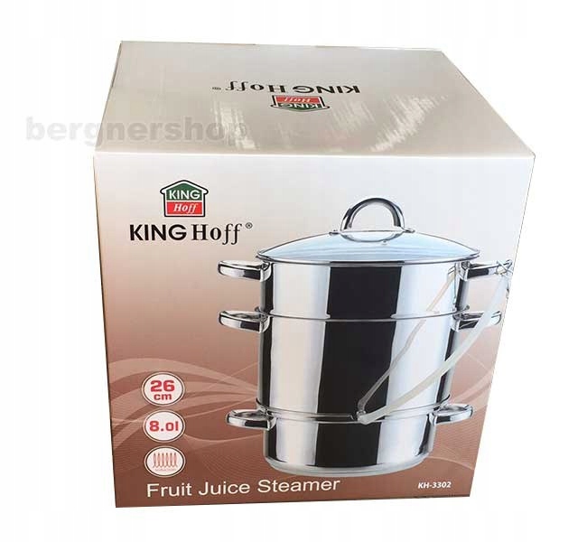 Соковыжималка дает вам возможность легко сделать домашний сок из ваших любимых фруктов или овощей. Мы получаем пастеризованный сок, поэтому мы можем легко хранить его в течение более длительного периода времени. Соковыжималка Kinghoff 8L позволит вам приготовить вкусный сок максимум через 2 часа. Эта модель соковыжималки также адаптирована для использования ее на индукционных печи. Тройное акукторическое дно обеспечит многолетнее удовлетворение от продукта. Соковыжималка изготовлена из нержавеющей стали 18/10. Вылейте свободно в контейнер для фруктов, покрывая соответствующее количество сахара (таблица в руководстве пользователя)- нанесите крышку приготовленной соковыжималки на кухню и тепло в течение определенного времени в зависимости от типа используемых фруктов или овощей. До кипения, вы должны дать максимально возможное тепловое снабжение (газовое пламя или уровень нагревательной пластины - в зависимости от духовки). Тепловой податель должен быть уменьшен с момента освобождения паровых облаков.