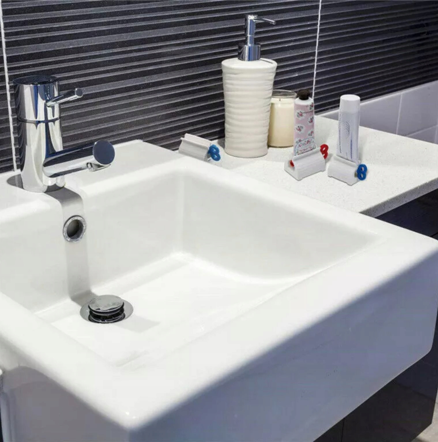 Не волнуйтесь, стоящий тюбик с зубной пастой не опрокинется — это будет хорошим признаком гигиены в ванной комнате. .