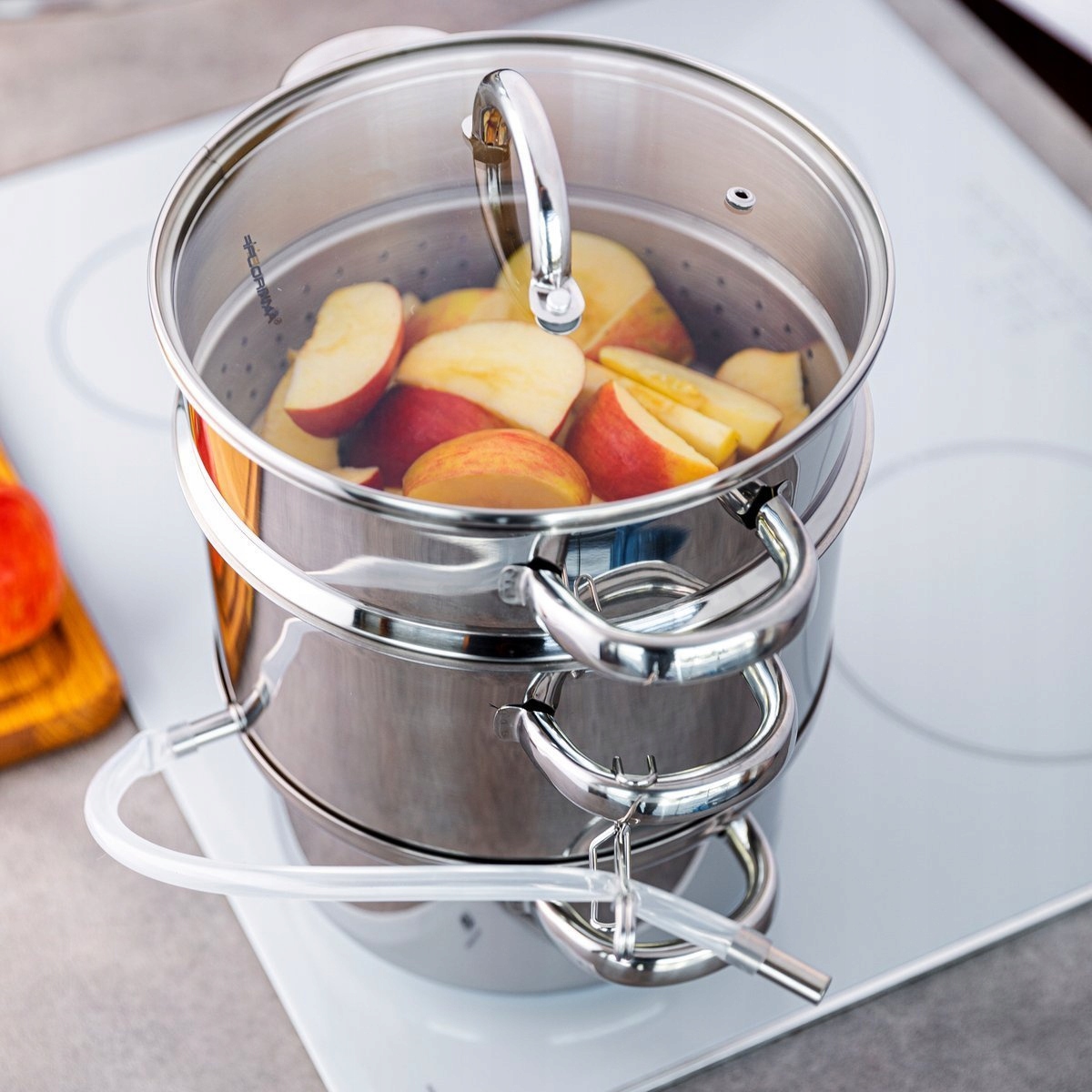 Соковыжималка Florina — лучший способ сохранить вкус лета в виде вкусных и полезных соков. Емкость объемом 5 литров состоит из нижнего сосуда размером 20 х 11 см, среднего сосуда размером 20 х 11,5 см, испарителя размером 22 х 11,8 см и стеклянной крышки. Все элементы изготовлены из нержавеющей стали высочайшего качества, главным преимуществом которой является долговечность и прочность. Соответствующая толщина стенок и многослойное дно означают, что соковыжималка очень быстро нагревается и поддерживает постоянную температуру внутри. Благодаря этому процесс приготовления сока длится от 30 минут до максимум 1 часа (все зависит от твердости фруктов). Используя это блюдо, вы можете быть уверены, что не потеряете ни малейшего количества еды. Оставшуюся мякоть можно использовать для приготовления джема.