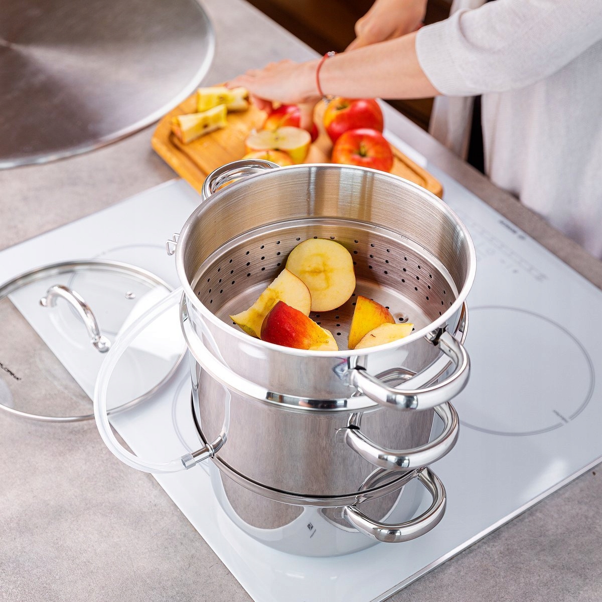 Знаете ли вы, что соковыжималку можно использовать и как пароварку? Благодаря пароварке вы сможете очень быстро и полезно приготовить картофель, цветную капусту или другие овощи. Термостойкая стеклянная крышка позволяет полностью контролировать процесс приготовления. Сосуд предназначен для каждого типа плиты.