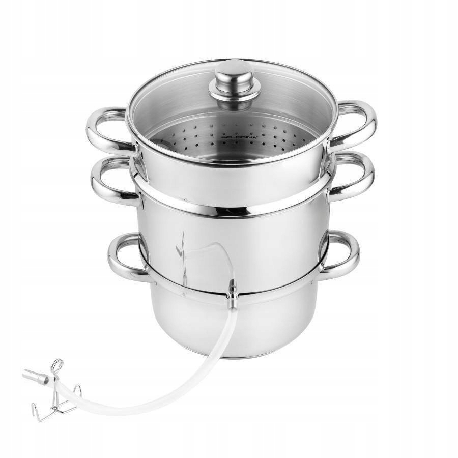 Соковыжималка емкостью 5 л отличается прочной конструкцией из высококачественной нержавеющей стали 18/10, устойчивой к коррозии и внешним факторам. Сосуд состоит из нижней кастрюли размером 20 х 11 см, средней кастрюли размером 20 х 11,5 см, испарителя размером 22 х 11,8 см и стеклянной крышки. Многослойное дно и подходящая толщина стенокобеспечивают быстрое распределение тепла, поэтому процесс приготовления сока длится максимум 1 час. Соковыжималку также можно использовать как емкость для здорового приготовления овощей на пару. Это многофункциональное предложение от бренда Florina подходит для использования на плитах любого типа.
