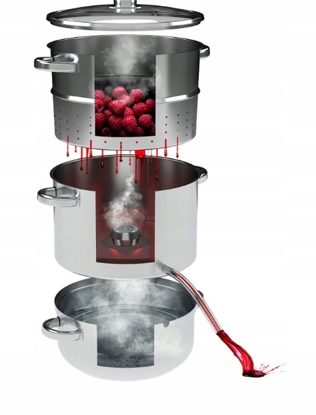 Подготовленный набор поставьте на источник тепла (газовый, электрический плита и т. д.) и медленно доведите воду до кипения. Как только вода закипит, уменьшите огонь до такой степени, чтобы вокруг сосуда не образовывался чрезмерный пар. Под воздействием образующегося пара и повышенной температуры плоды начнут выделять сок и накапливаться в емкости №2.
