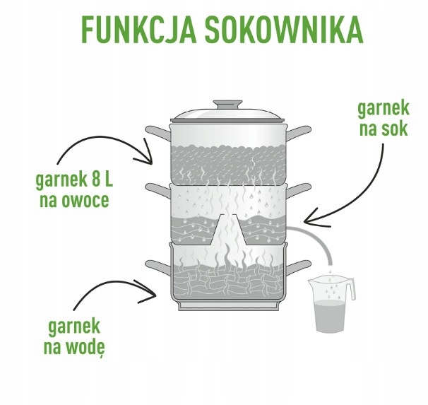 Набор состоит из трех штабелируемых сосудов, крышки и шланг с хомутом. Верхний сосуд (№1) – для фруктов (до 8 литров). Средний сосуд (№2) – для сока, который можно разливать в бутылки или банки через подсоединенный сливной шланг. Нижний сосуд (№3) – для воды. Соковыжималку можно использовать на плитах любого типа.
