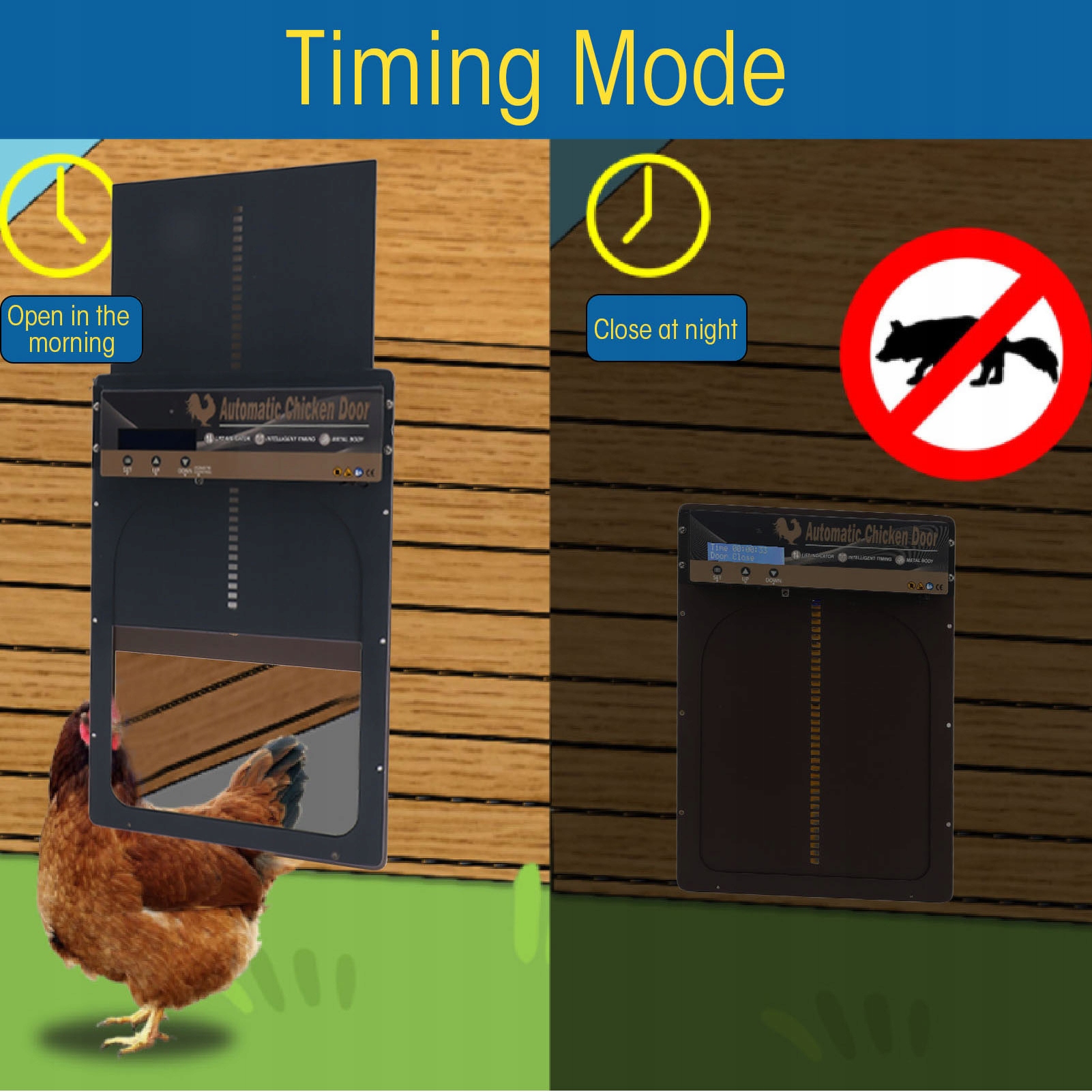 3. Функция таймера: режим таймера позволяет вручную устанавливать время открытия и закрытия двери курятника в зависимости от сезона, направления и поведения цыплят в неволе, достигая удобного и эффективного эффекта. Он также защищает ваших кур, уток и другую домашнюю птицу от других хищников, таких как ласки, в ночное время.