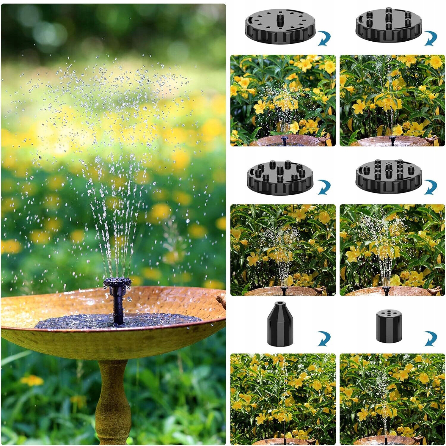 ⛲【6 различных распылительных головок】 Содержит 6 различных насадок, вы можете комбинировать 13 различных форм. и схемы распыления, отрегулируйте высоту и режим подачи воды, заменив форсунки, чтобы избежать разбрызгивания воды за пределы резервуара. Высота струи может достигать 30-50 см, что добавит веселья в ваш сад.