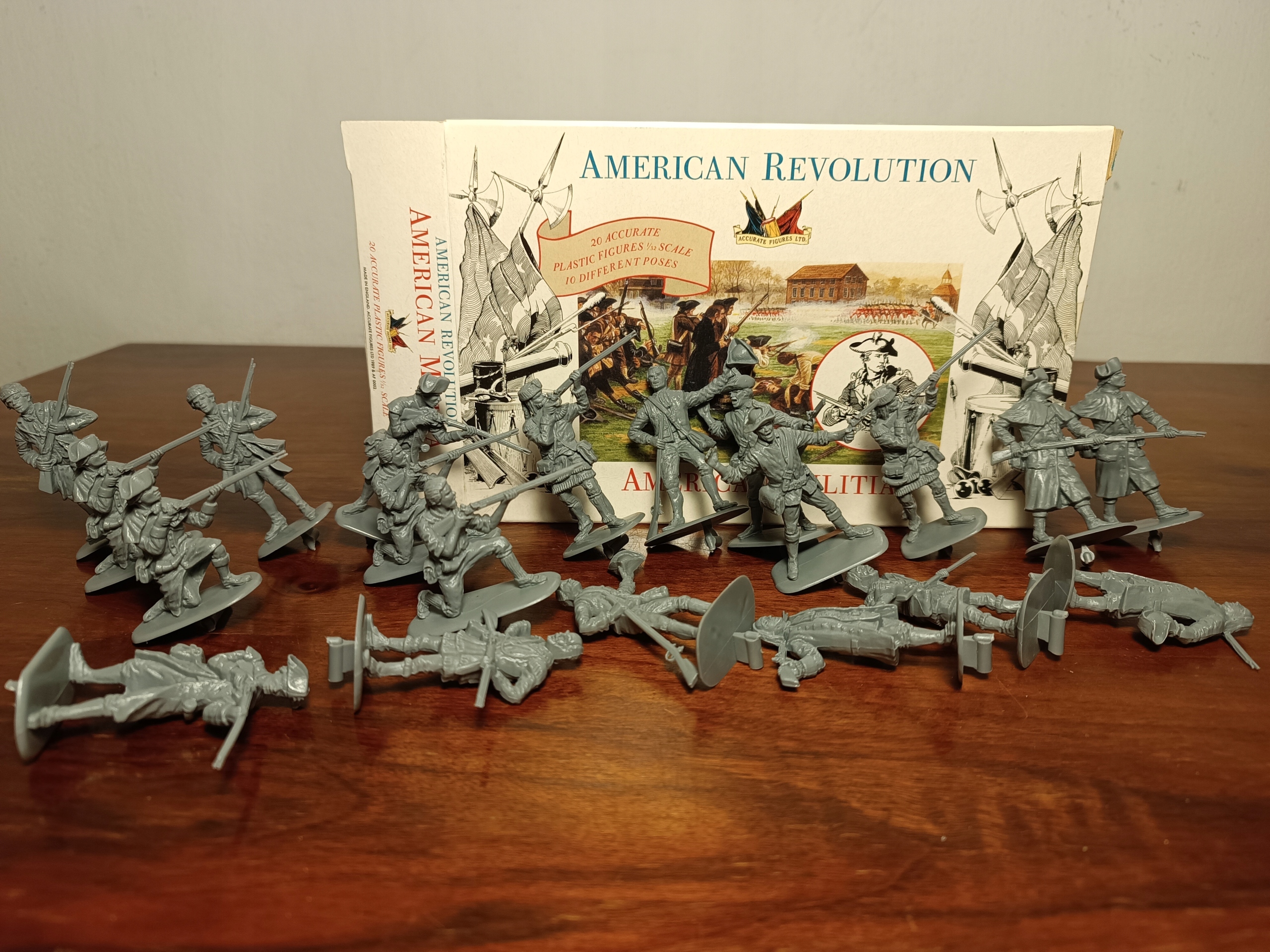 Полный набор старых фигурок британского производства компании Accurate в оригинальном состоянии. Солдаты Войны за независимость, американская милиция. Фигурки никогда не использовались, только вырезаны из рамок, их остатки до сих пор лежат на подставках. Коробка также в очень хорошем состоянии.