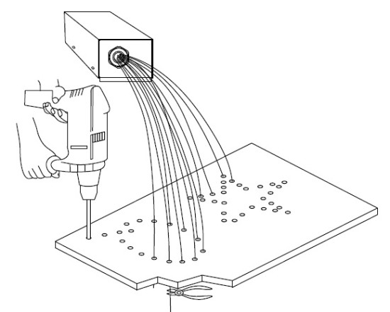 В начале это Лучше всего нарисовать на доске те места, где мы хотим поставить звезды. Затем просверлите отверстия и протяните свободные концы оптоволокна со стороны потолка.