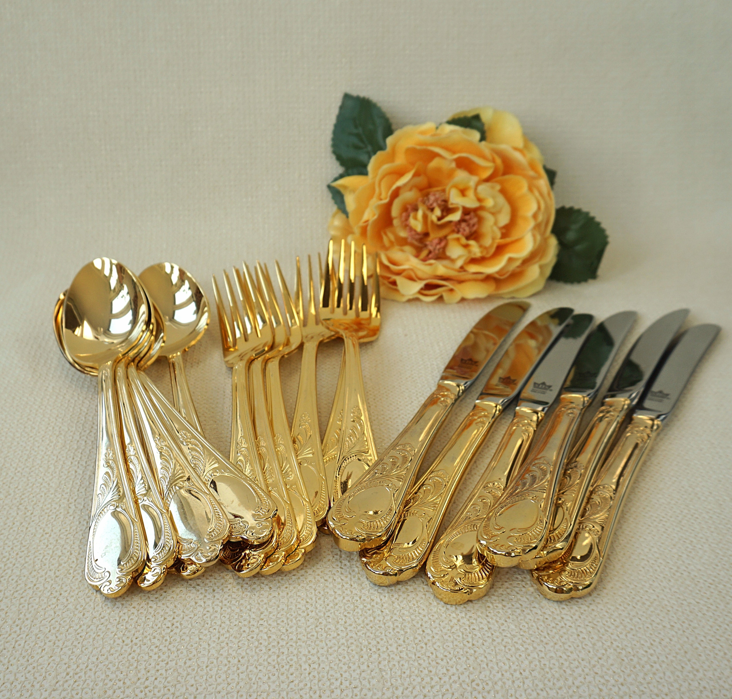 Золотые столовые приборы: hartvergoldet 23/24 karat . Позолота покрывает все столовые приборы, за исключением лезвий ножей.