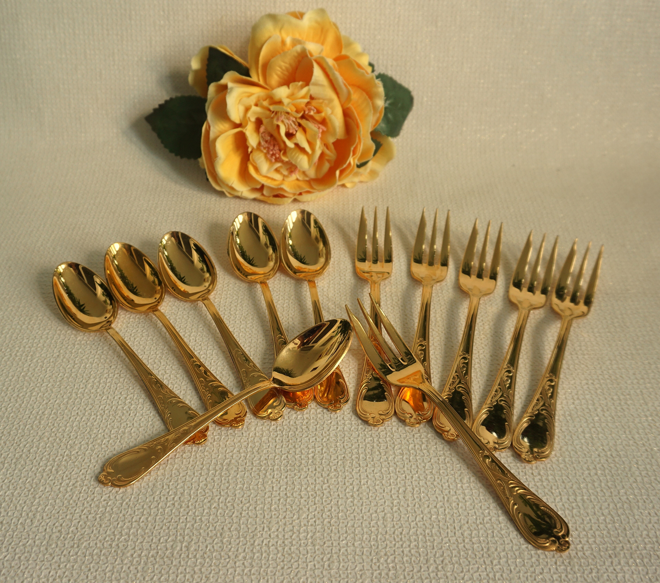 Позолоченный столовые приборы: hartvergoldet 23/24 karat . Позолота покрывает все столовые приборы.