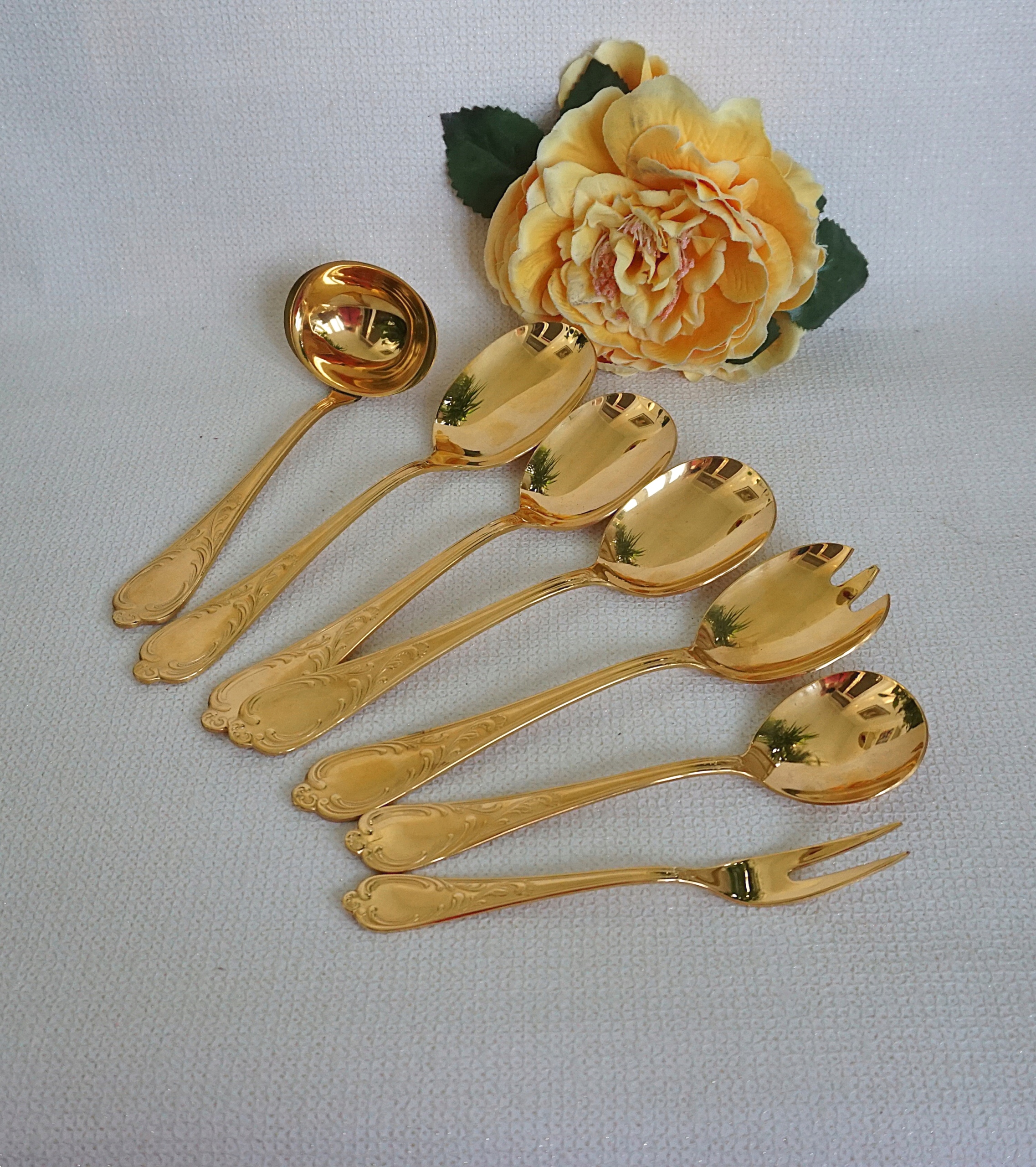 Позолоченный столовые приборы: hartvergoldet 23/24 karat . Позолота покрывает все столовые приборы.