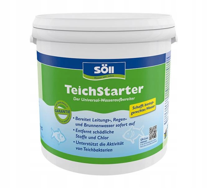 Водопровод вода часто содержит хлор и тяжелые металлы (особенно медь и железо) и поэтому непригодна для садового пруда. TeichStarter устраняет агрессивный хлор и вредные тяжелые металлы, создавая тем самым начальные условия для здорового биотопа. Дождевую воду следует очищать перед использованием ее в пруду, поскольку она содержит пыль и другие загрязнители атмосферы и часто имеет низкий уровень pH (так называемый «кислотный дождь»). TeichStarter регулирует значение pH в оптимальном диапазоне (для обитателей пруда) от 7,5 до 8,3 градусов и стабилизирует его за счет повышения карбонатной жесткости.