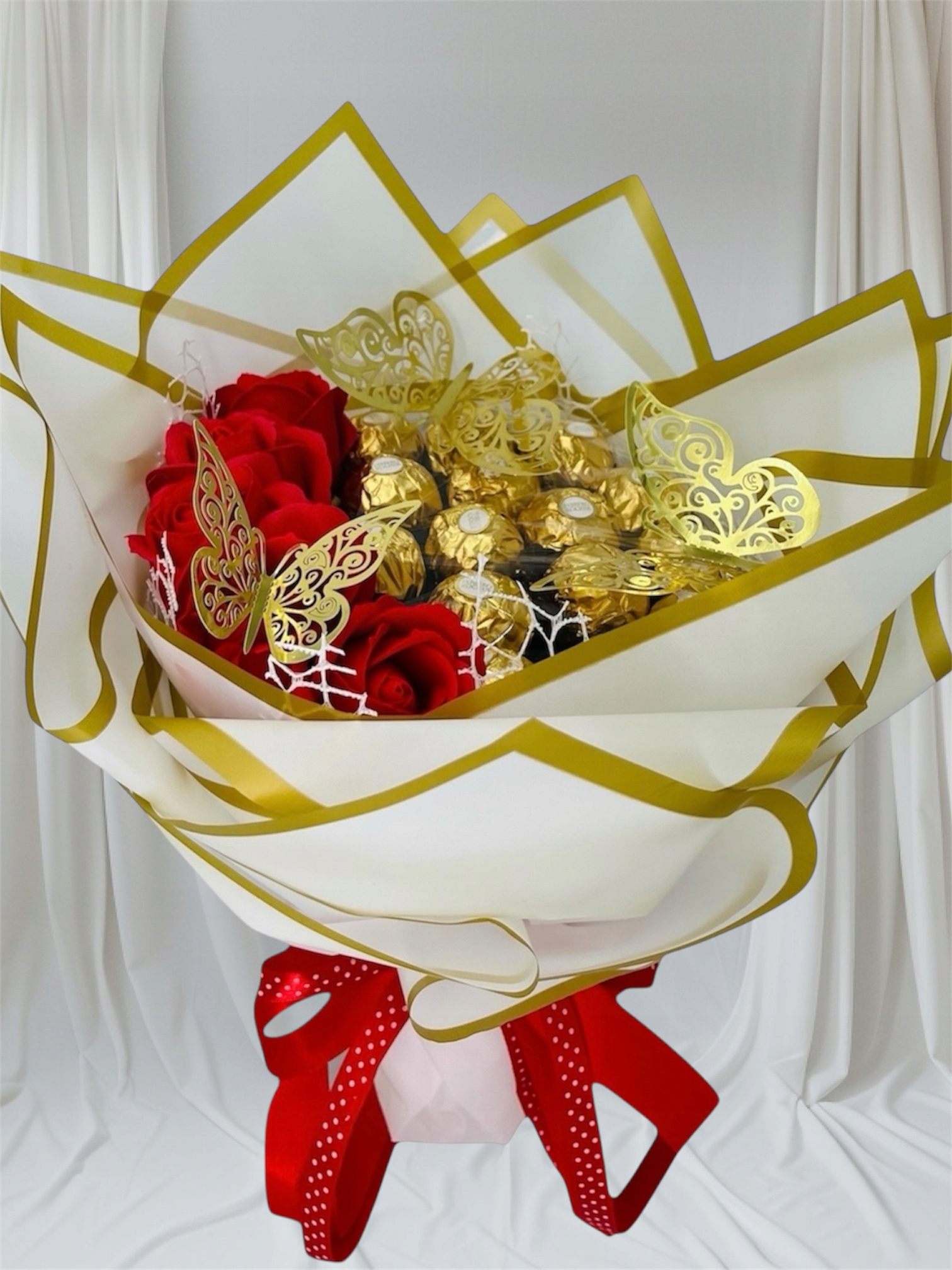 - большой, элегантный букет с золотыми пралине Ferrero Rocher и мыльными розами