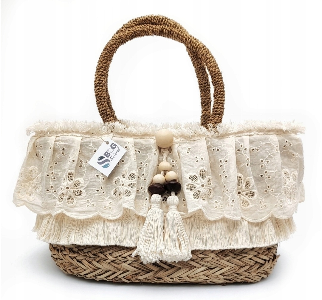 Откройте для себя волшебство лета с сумкой SBagNatural! Эта уникальная корзина из натуральных морских водорослей — суть стиля бохо. Внимание привлекает романтическая кремовая английская вышивка с нежными цветочными узорами, отделанная очаровательной бахромой. Большие размеры и молния делают ее не только красивой, но и чрезвычайно практичной. Идеально подходит для пляжа, шоппинга и летних прогулок!
