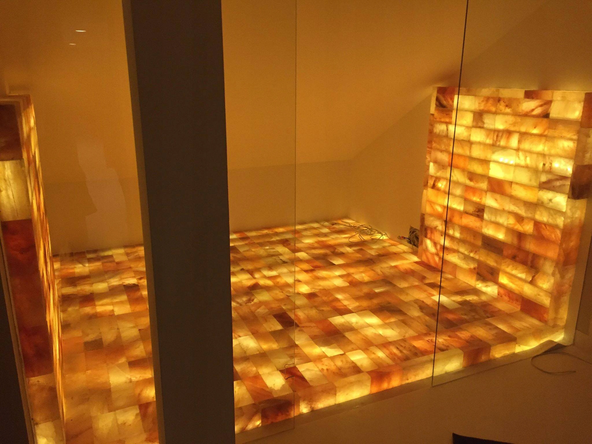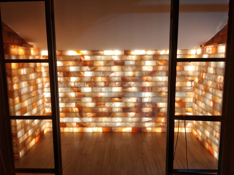 Соляные стены изготовлены из оригинальных гималайских соляных кирпичей, импортированных нашей компанией из Пакистана.
