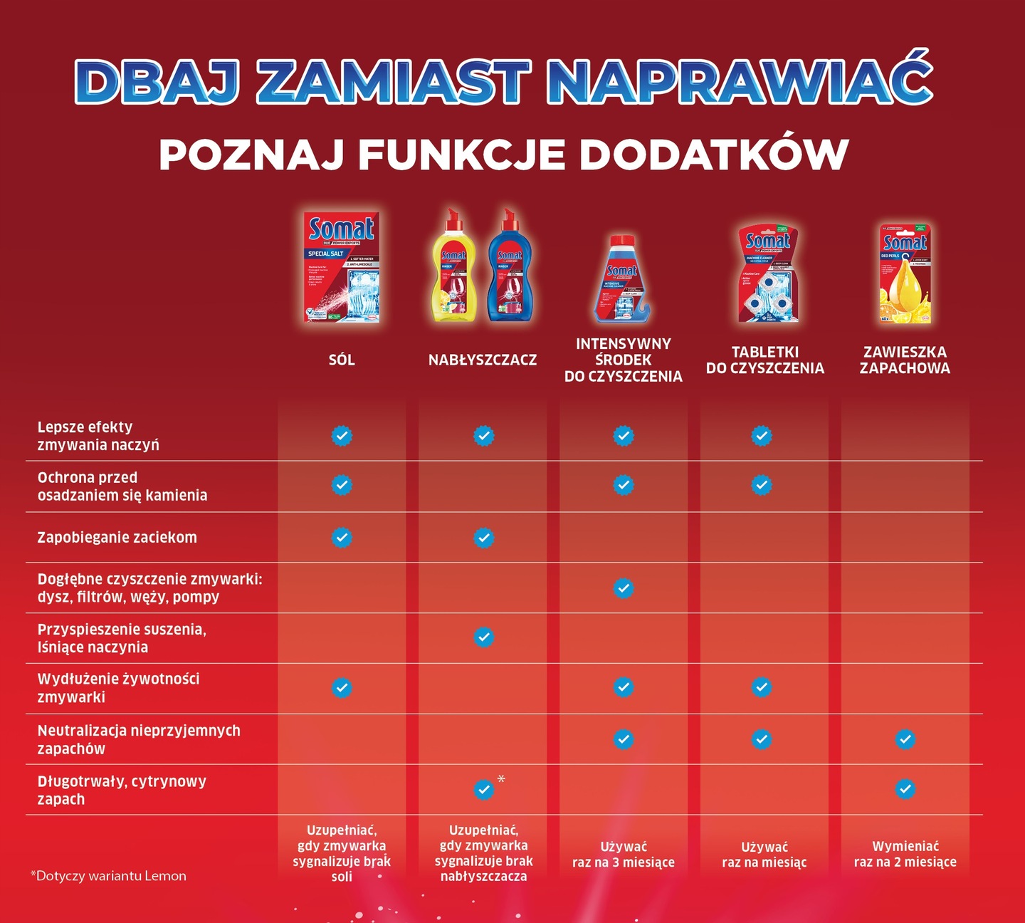 Благодаря более чем 50-летнему опыту и немецким технологиям компания Somat фокусируется на потребностях потребителей и инновациях. Заботясь об охране окружающей среды, в апреле 2016 года компания Somat ввела новые стандарты качества своей продукции, не содержащей фосфатов. Somat предлагает широкий ассортимент чистящих средств и добавок для посудомоечных машин, включая инновационные продукты, такие как таблетки Somat Gold с 12 функциями для эффективного устранения ожогов.
