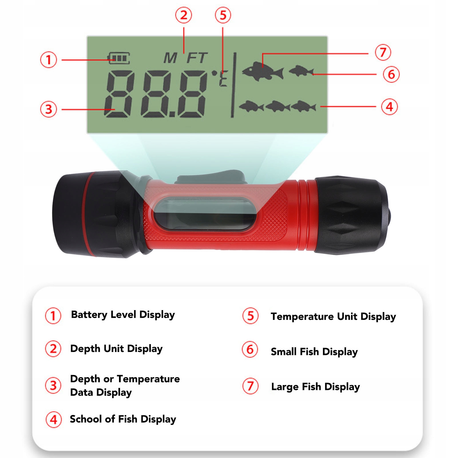 Особенность:1. Полезный дисплей данных: портативный эхолот с ЖК-экраном, более прозрачный для отображения NaNa, легкое знание уровня заряда батареи, глубины воды, температуры и значков рыбы. Между тем, блок измерения глубины можно свободно переключать с помощью ноги или метра.