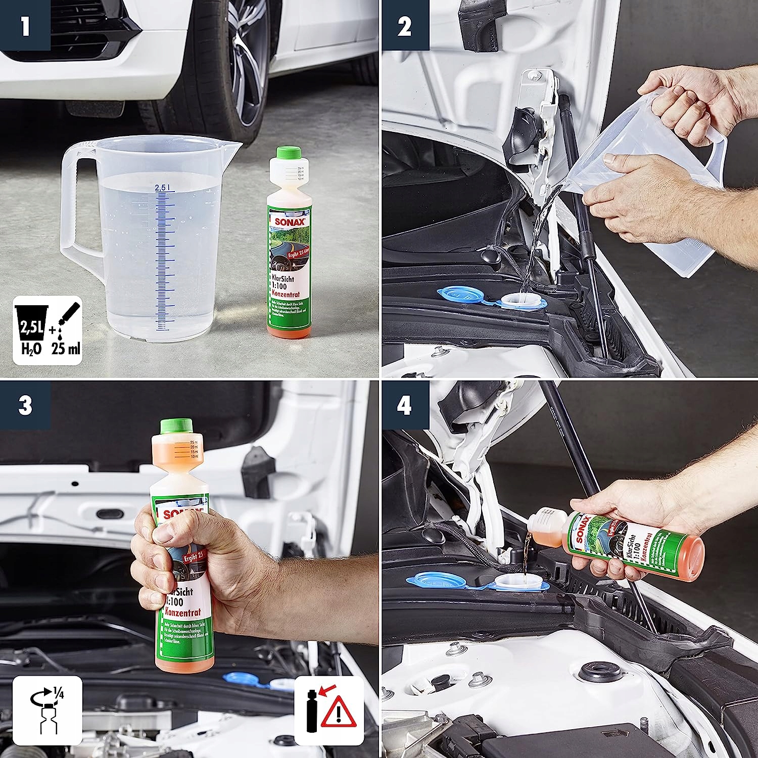 Советы по использованию: открутить захват четверти поворота. Полностью открутите насасывание и добавьте содержание пошитной камеры в воду ветрового стекла. 25 мл достаточно для 2,5 литров воды.