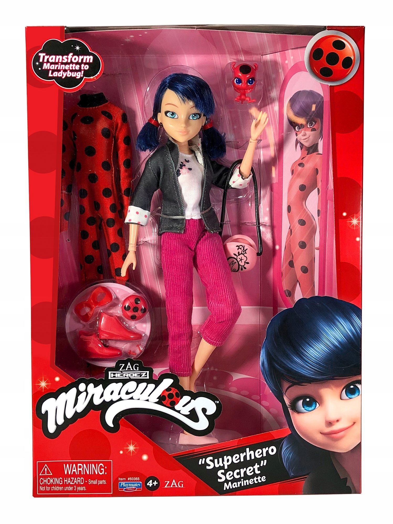 В набор Чудесная тайна супергероя содержит куклу, изображающую главную героиню мультипликационной сказки - Маринетт в классическом наряде. На ней белая блузка и серая куртка, розовые брюки и розовые туфли. Всего за несколько мгновений ваш ребенок сможет превратить Маринетт в супергероиню Ледибаг, одев ее в красный костюм в черный горошек, красные туфли и надев на лицо маску.