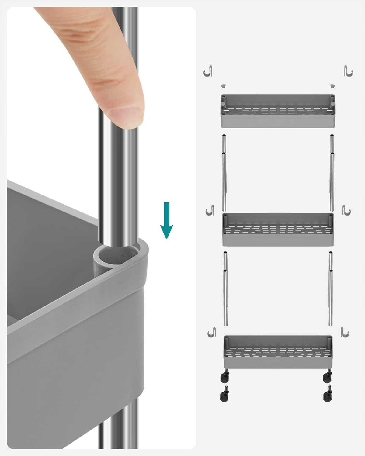 Что вы получаете: никелевая полка с высококачественными колесами для плавного катания назад и вперед, 3 крючка для подвешивания мелких предметов, полки с вырезом для оптимальной вентиляции и стиля в вашу гостиную, ванную комнату или кухню.