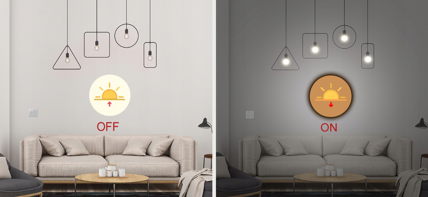 Коммутатор имеет два новых режима: режим восхода солнца и режим заката. С помощью приложения можно установить график, по которому свет в доме включается с закатом и выключается с восходом солнца. Например, вы можете установить расписание, при котором свет включается на 40 % в 18:00, в 19:00 свет включается на 100 % и выключается в 6:00.