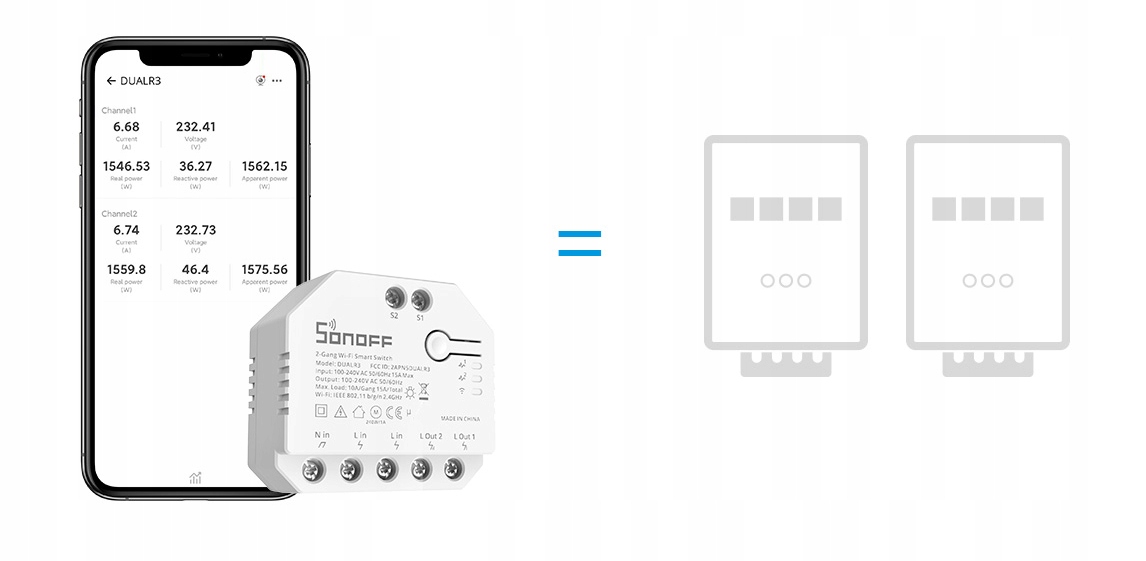 Sonoff DUAL R3 предлагает независимые измерения для обоих каналов. б> . Таким образом, вы можете контролировать потребление двух независимых конечных устройств.
