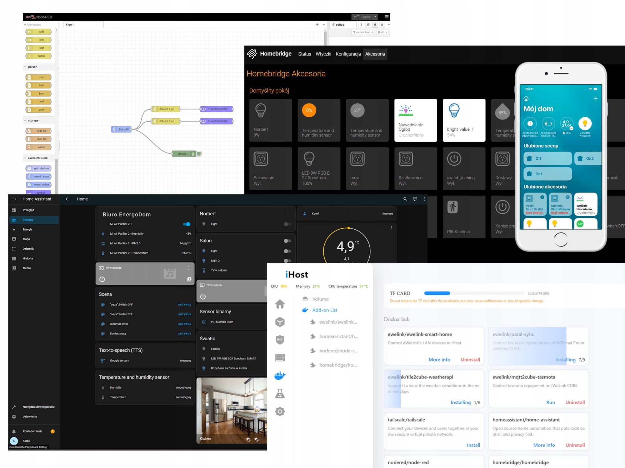 А может быть, у вас есть аксессуары Sonoff, Tuya или Tasmota, и вы бы хотели, чтобы они работали вместе? Вы можете использовать Node-Red или HomeAssistant. Соответствующие плагины позволят вам загружать выбранные приложения со своих устройств в одном месте. Создание сцен и автоматизация больше не проблема. В настоящее время можно установить Home Assistant без Supervisor — эта версия планируется.
