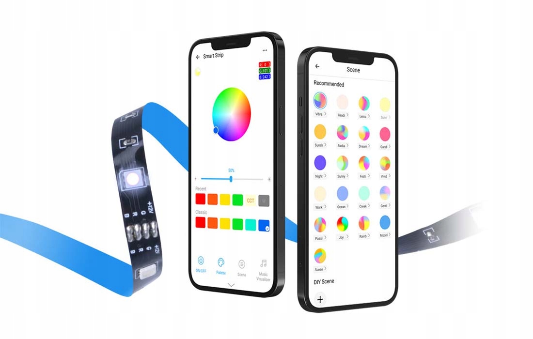 Выделенное приложение позволяет удобно управлять освещением. С помощью его помощи вы можете установить желаемую яркость и цветовую температуру света, а также выбор из 16 миллионов цветов RGB. Благодаря этому вы можете легко создать фантастическую атмосферу для каждого случая. Фильм ночь, или, может быть, рождественский ужин с семьей? Также возможно синхронизировать ленту с музыкой. Это отличное решение для вечеринки - танцуйте и посмотрите, как свет танцует с вами!
