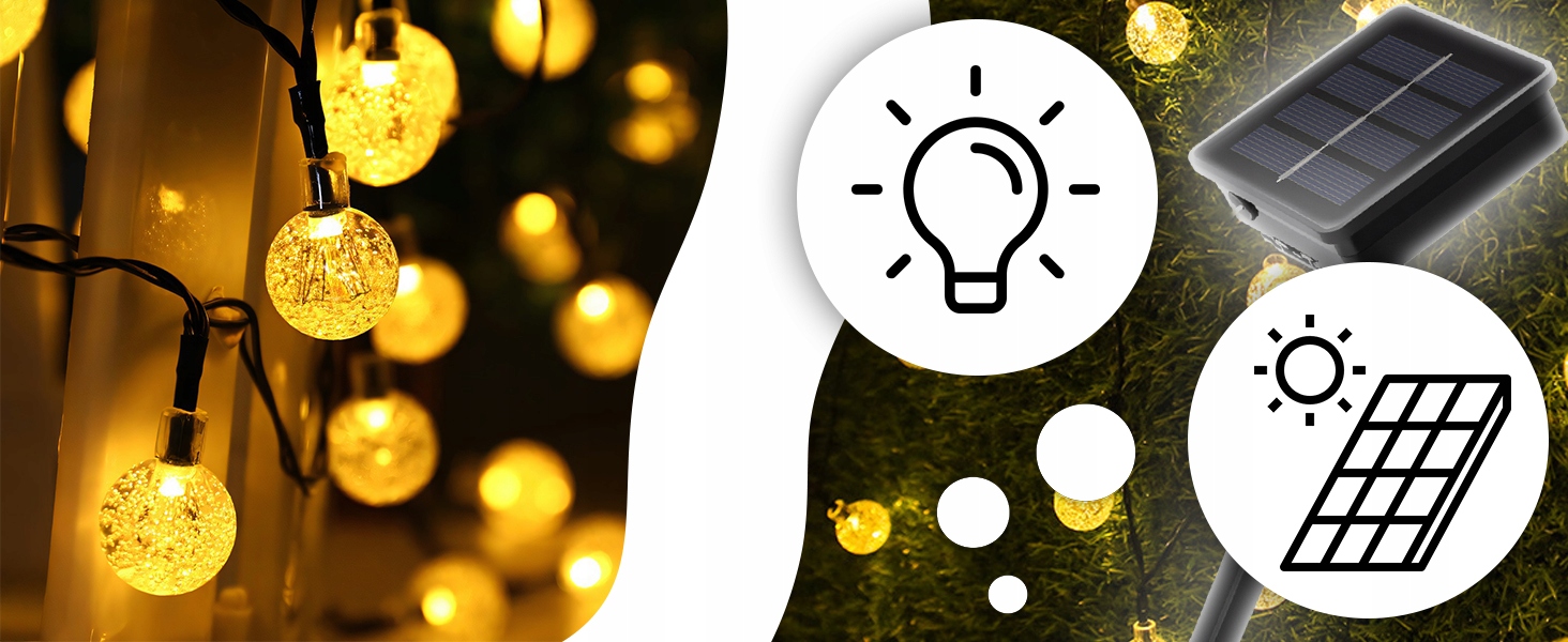 Солнечная гирлянда является идеальным решением для украшения садов, террасов или балконов, поскольку она не требует подключения к электрической сети. Благодаря солнечной панели, заряжается независимо в течение дня, что делает его энергетической и экологически чистой.