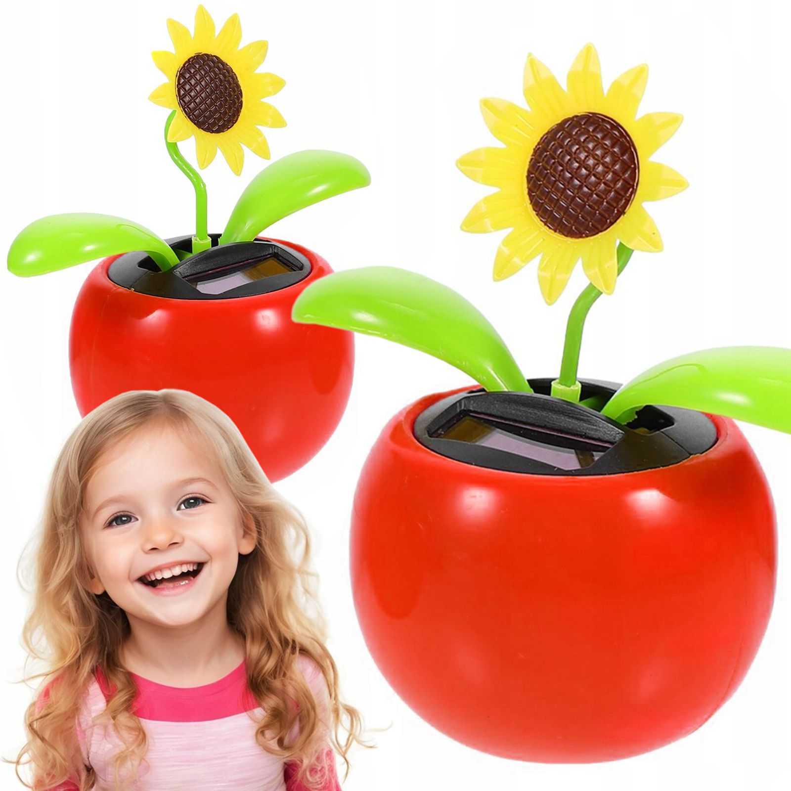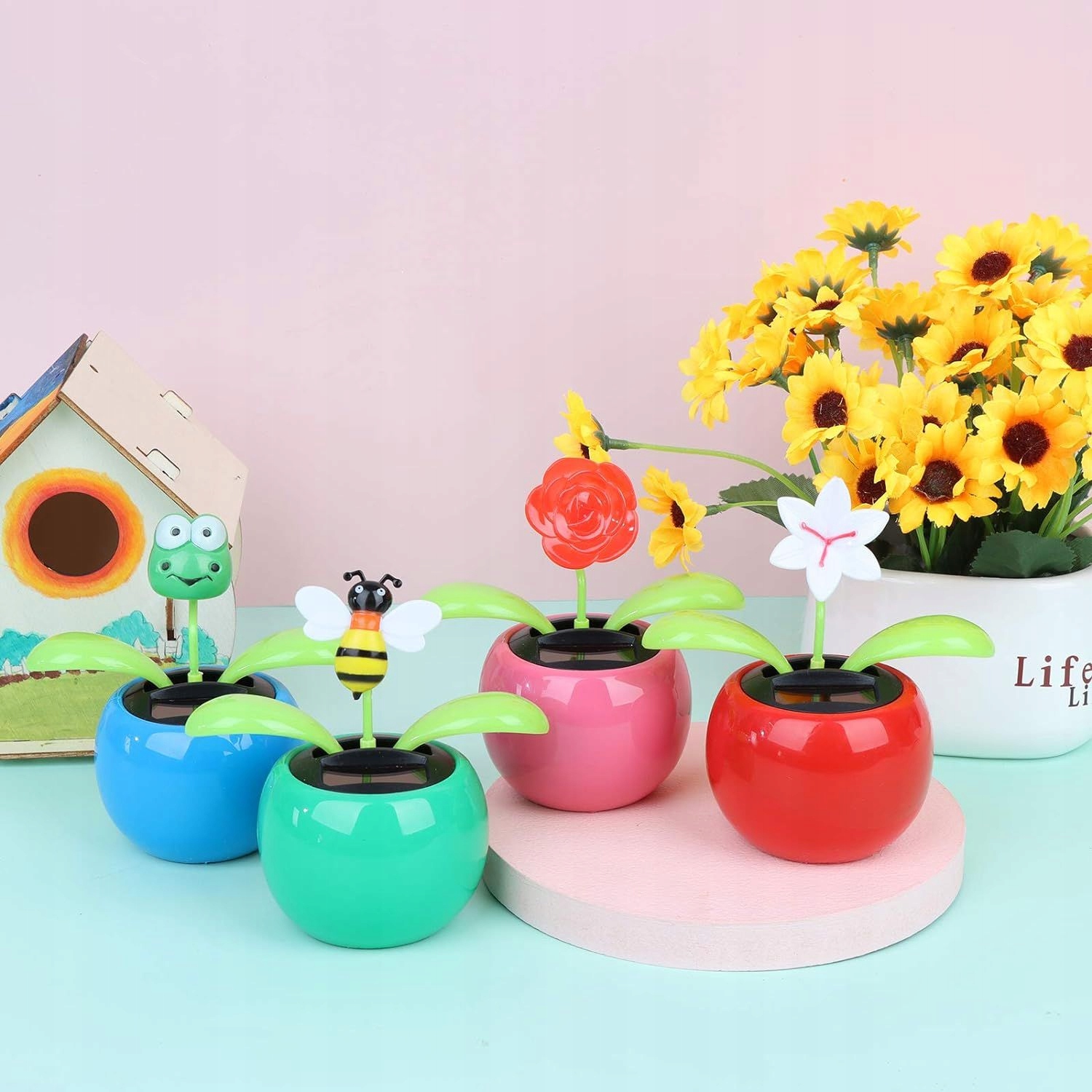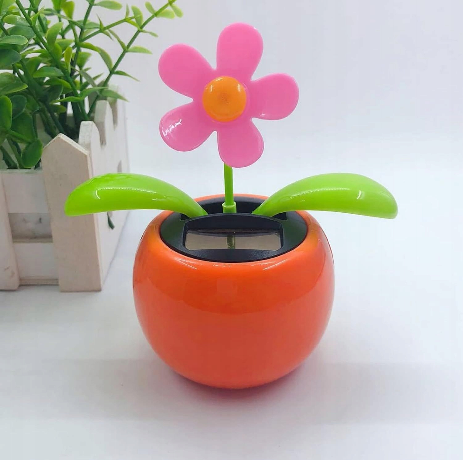 Красочная фигурка горшка с цветком или насекомым, которая раскачивается из стороны в сторону, когда на нее светит солнце.