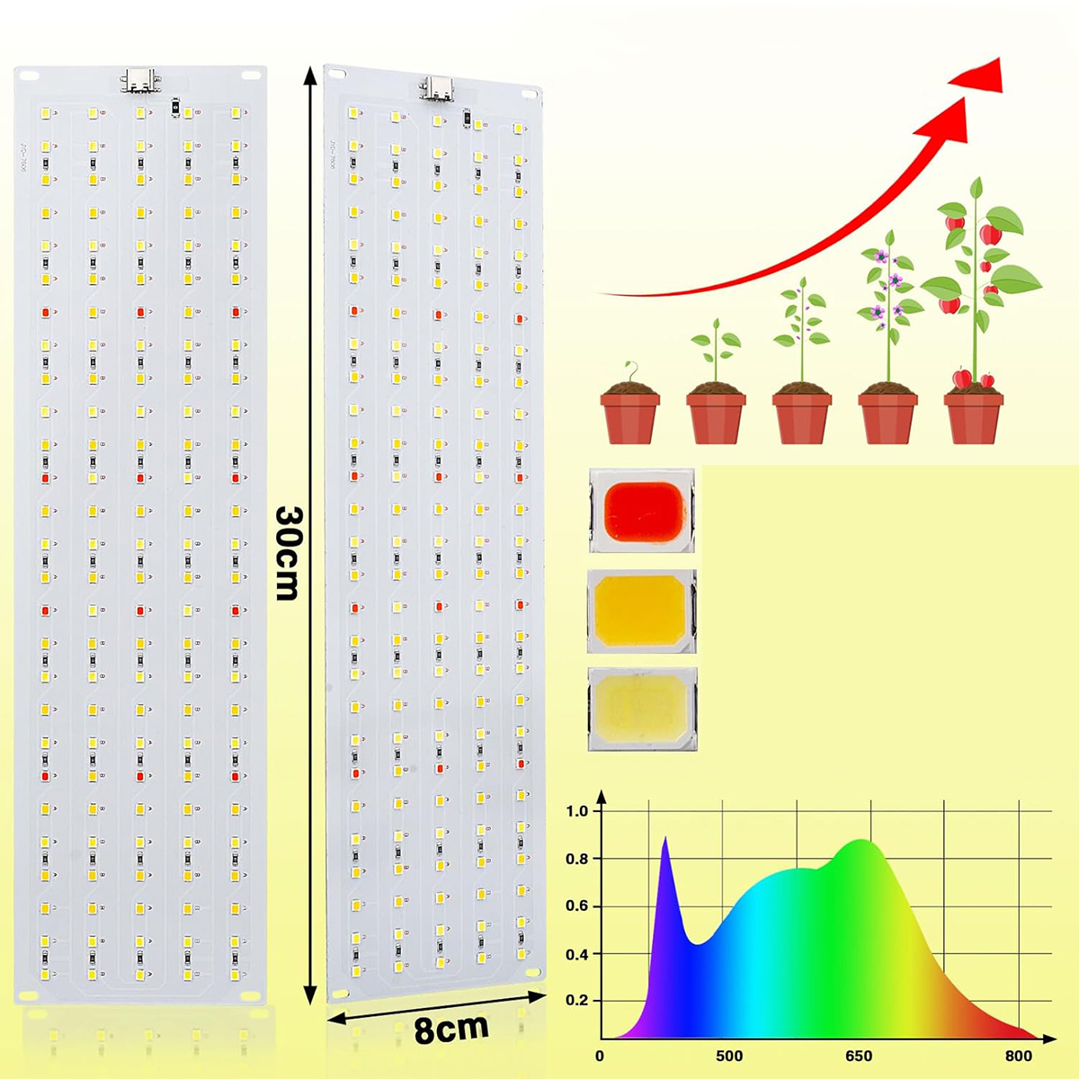 - Количество светодиодов на панель освещения для роста растений: 12 красных светодиодов 660 нм, 64 теплых белых светодиода 3000 К и 59 белых светодиодов 6000 К (всего 135 светодиодов, всего 4 панели для растений с 540 светодиодами).