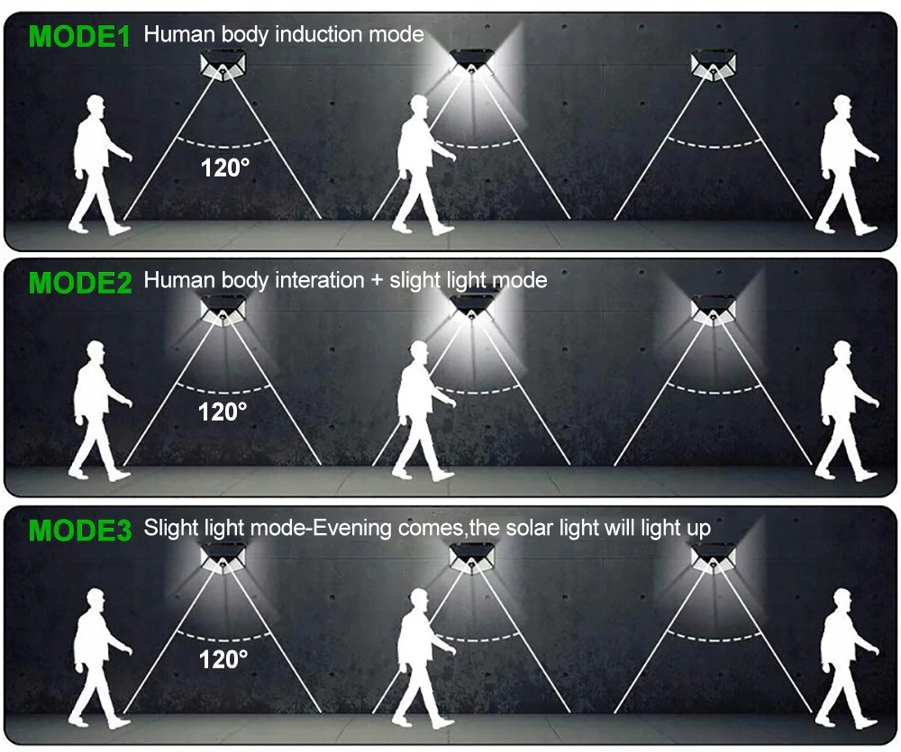 1. В верхней части фонаря расположена солнечная панель с сумеречным датчиком. После наступления сумерек основной свет включается, когда датчик обнаруживает движение в радиусе 4 метров, и выключается через 25 секунд, когда движение исчезает.