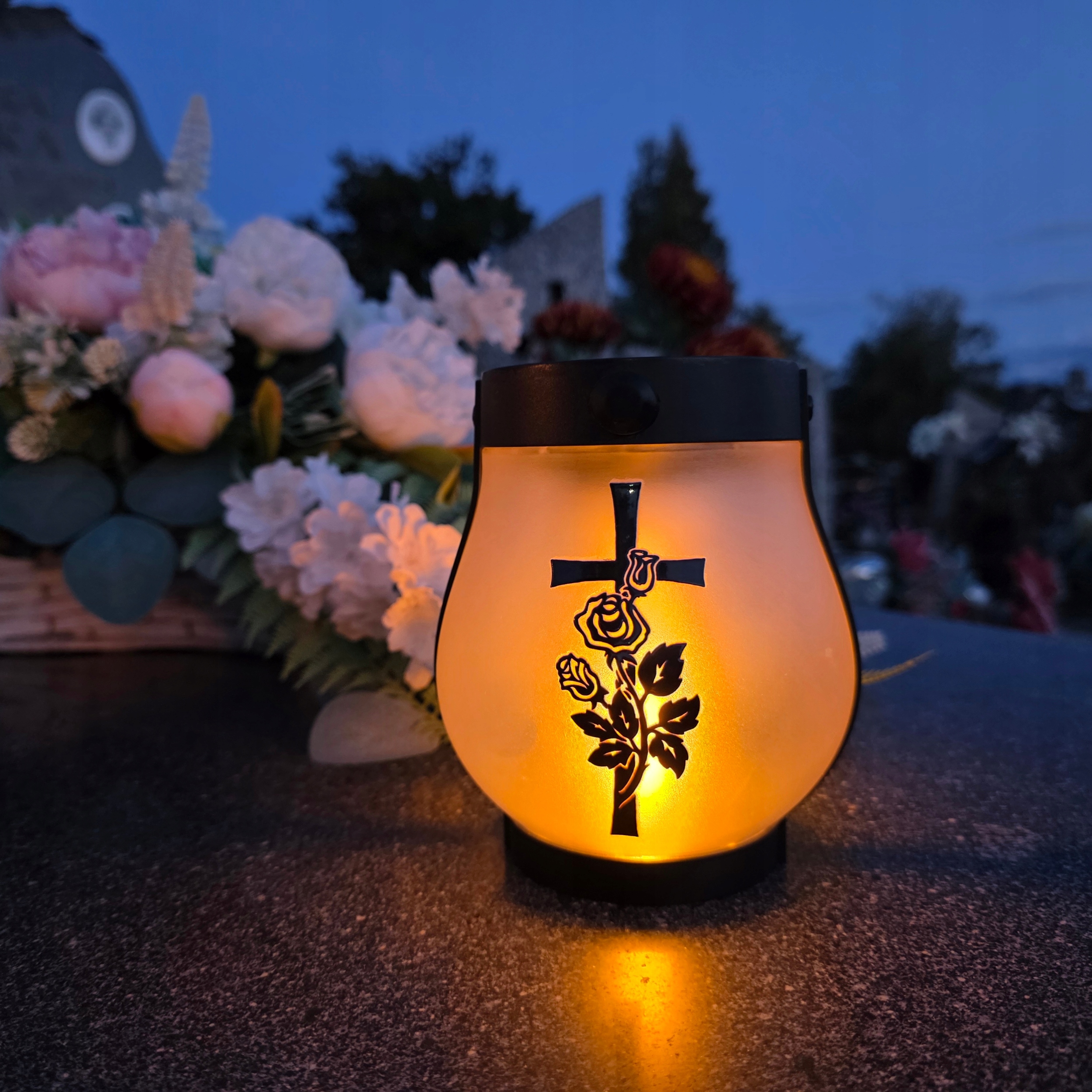 освещенный деликатным, теплым светом выглядит чрезвычайно достойным и заставляет надгробие принять исключительное очарование. Альтернатива обычным свечам.