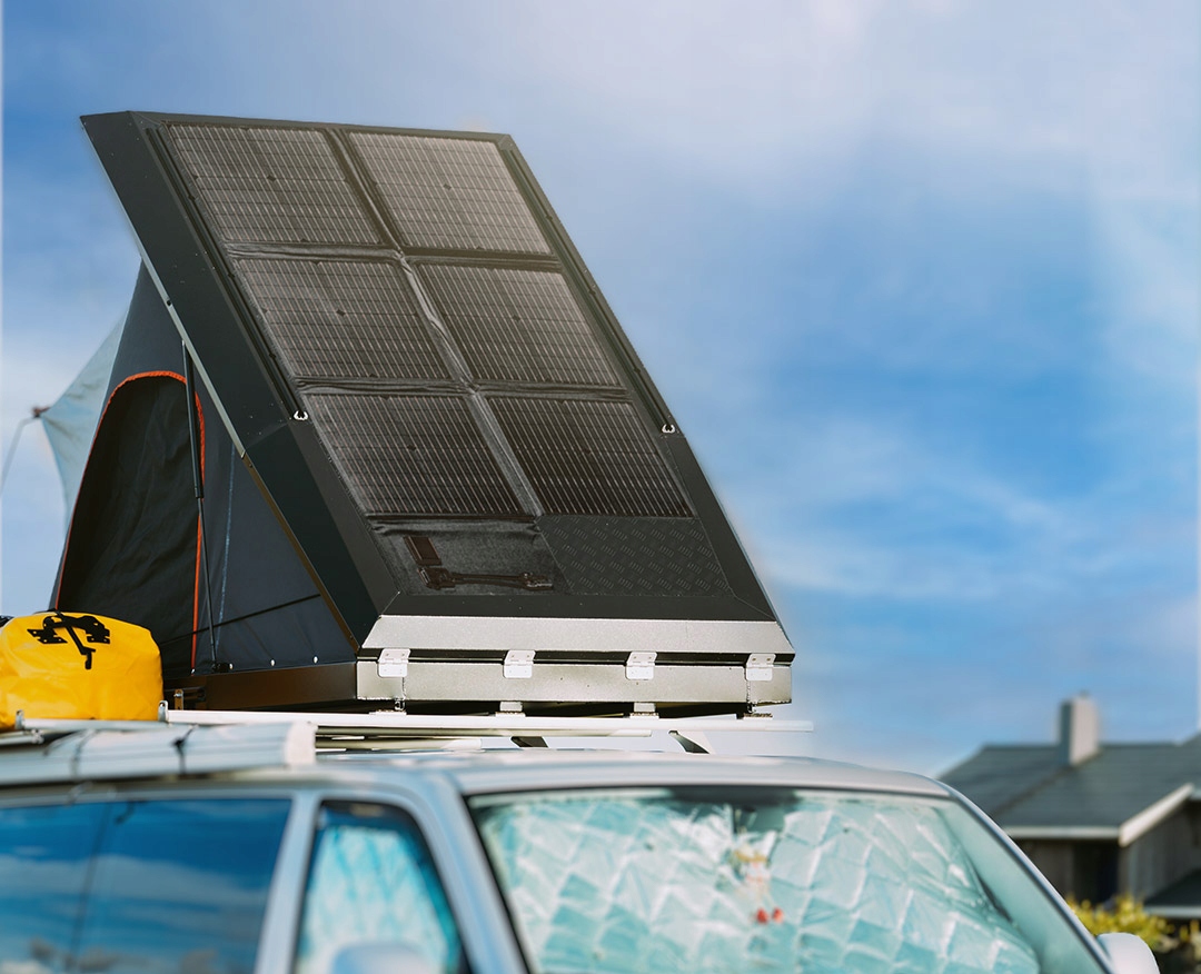 Оснащен мощностью 120 Вт, стабилизатором напряжения, 2 выходами USB и 1 выходом USB C. Характеризуется большой поверхностью в разложенном виде (1316х762х15 мм), оставаясь при этом компактным и удобным для транспортировки в сложенном виде. ( 380х370х50 мм).