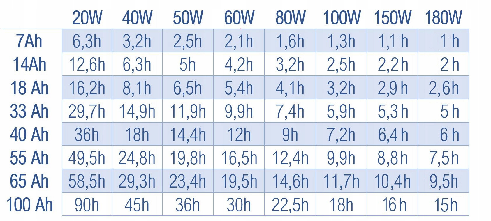 В таблице ниже показано время, необходимое для зарядки аккумуляторов, доступных на рынке, в зависимости от мощности фотоэлектрической системы.