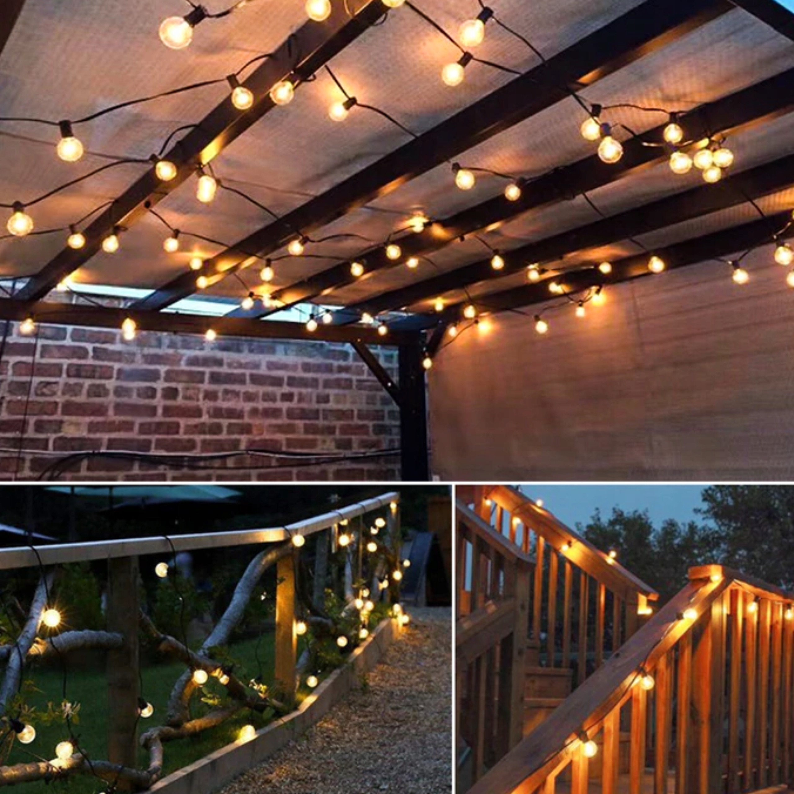 Просто повесьте веревку с лампочками в выбранном месте, например между деревьями, на перголе или балюстраде.