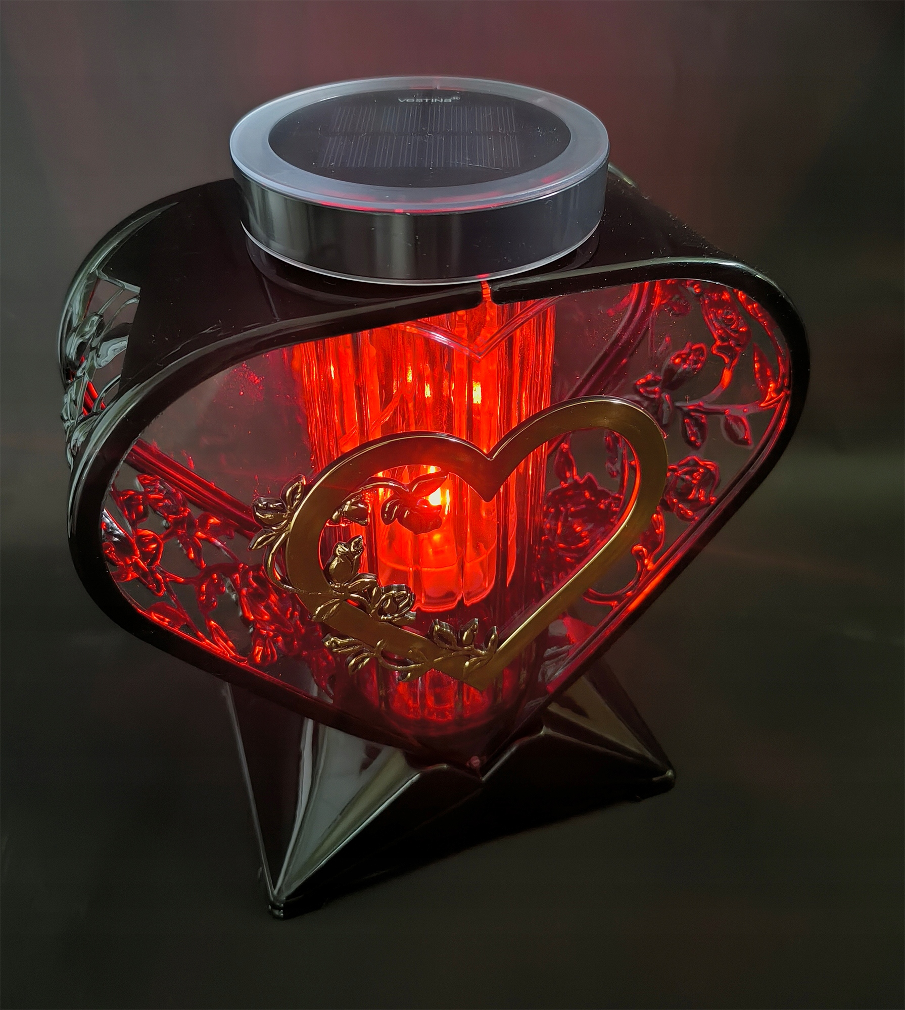 Жирный ланант. Большая солнечная панель была установлена в капюшоне свечи, которая заряжает аккумулятор «пламени». Черный корпус свечей был сделан из пластика и закончено глянцевым. Дайд свечей расположен на регулируемых направляющих и сияет вокруг часов, также в течение дня.