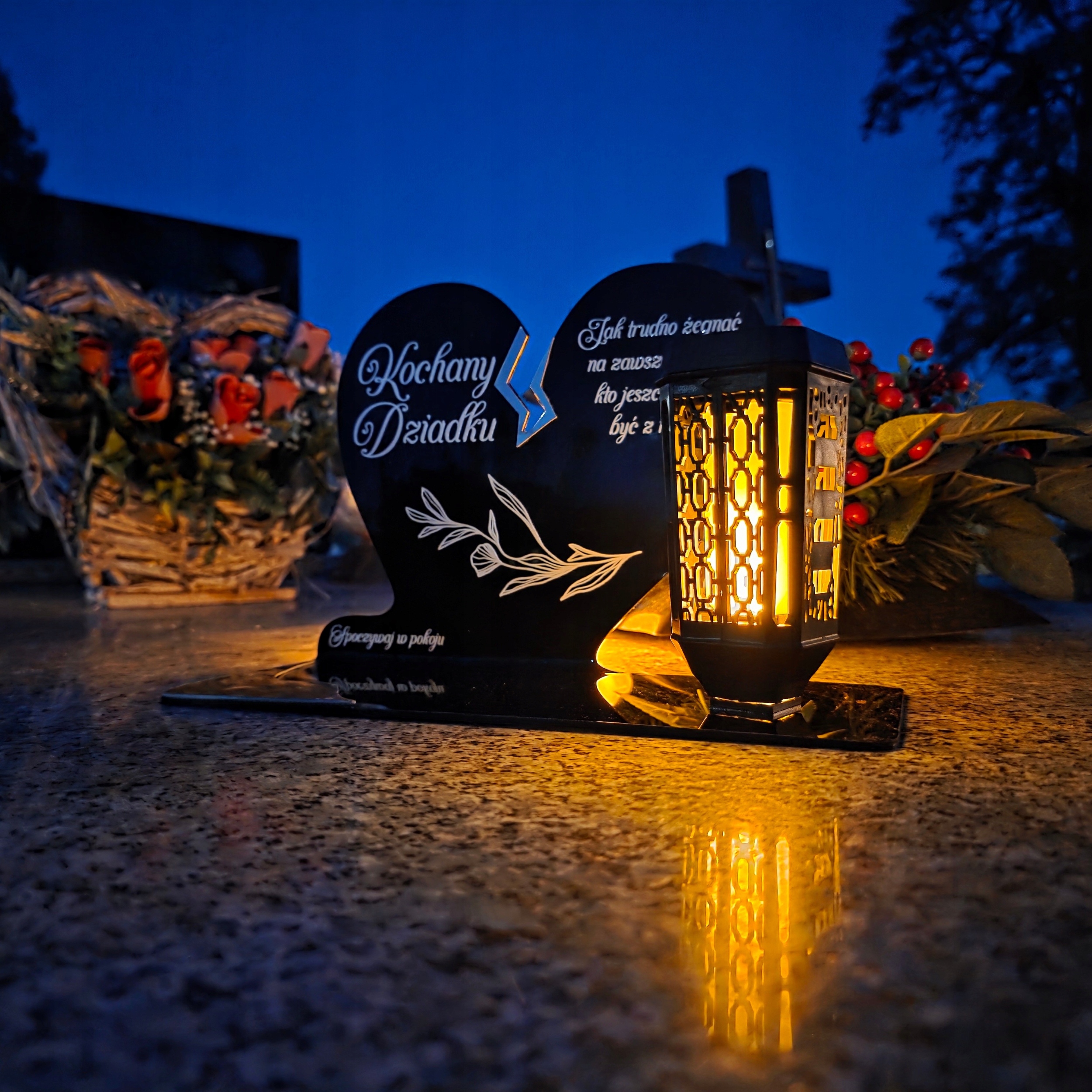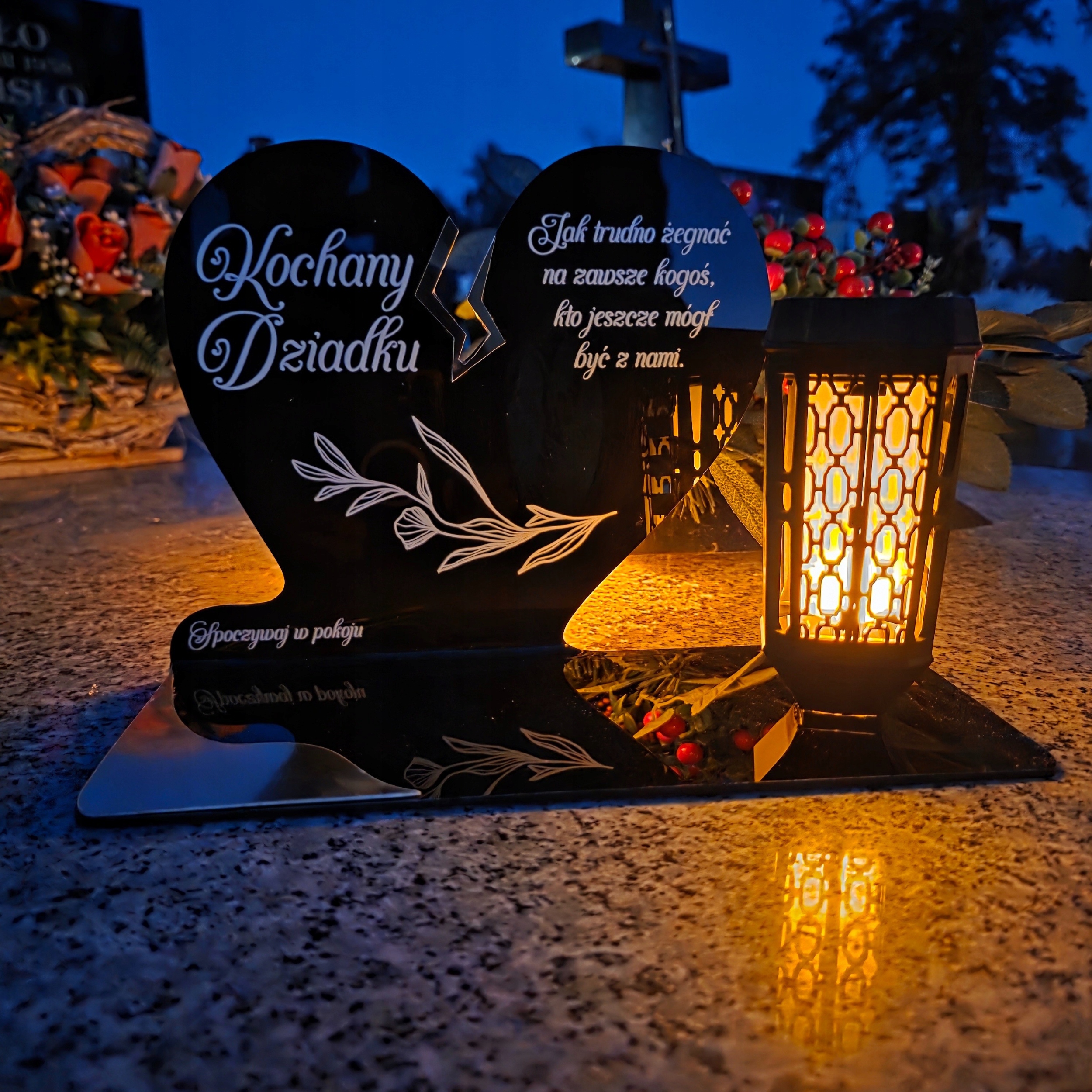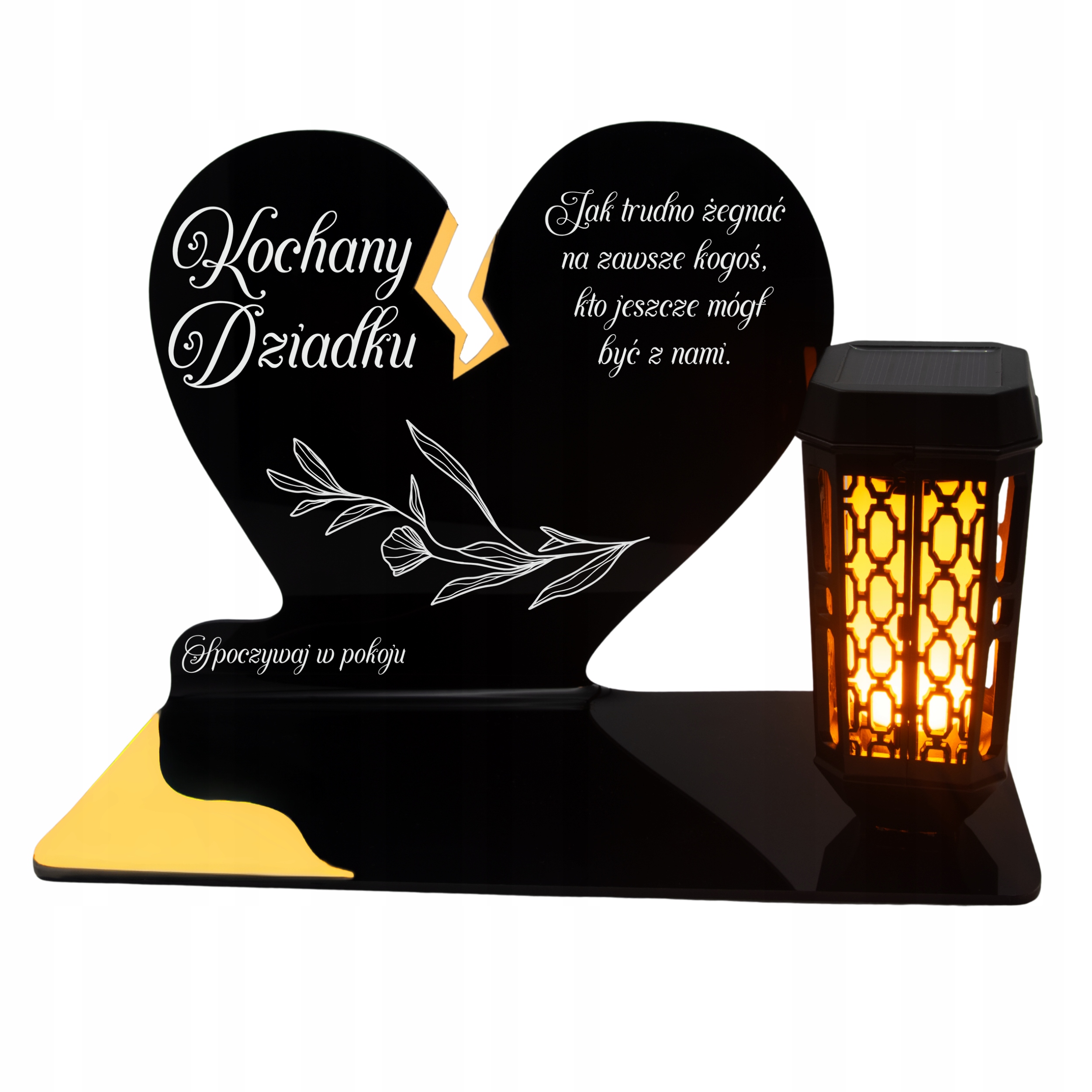 Эта уникальная могильная свеча в форме черного сердца с нежной золотой трещиной – прекрасный символ любви и памяти, который никогда не гаснет. Посвящение «Дорогой дедушка» и тонкий орнамент придают всей вещи трогательный и элегантный характер. Комплект дополняет современный светодиодный солнечный светильник, который освещает памятник теплым светом после наступления темноты, создавая атмосферу размышления и умиротворения.