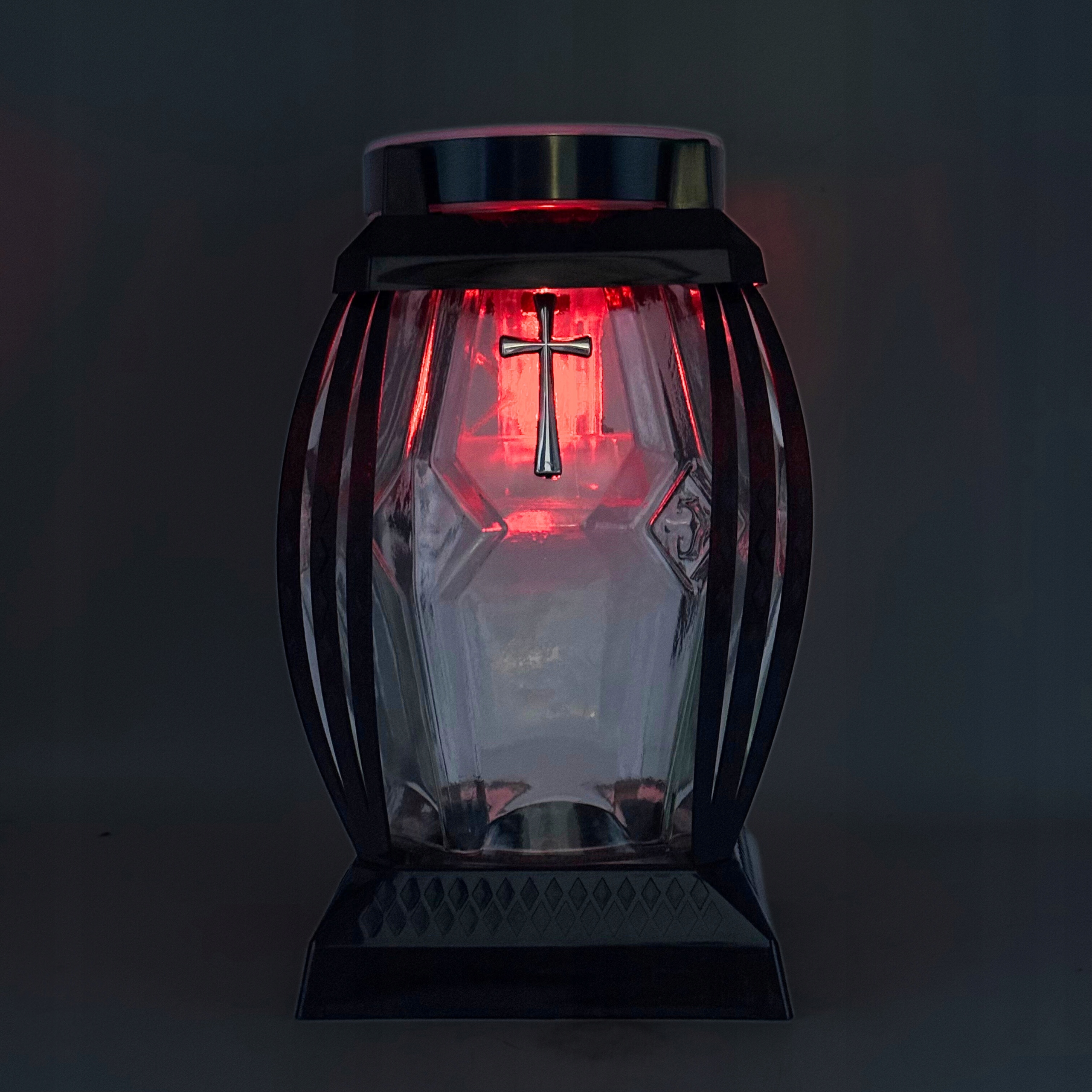 Солнечная свеча на могиле современного черного светодиодного серебряного креста фонаря