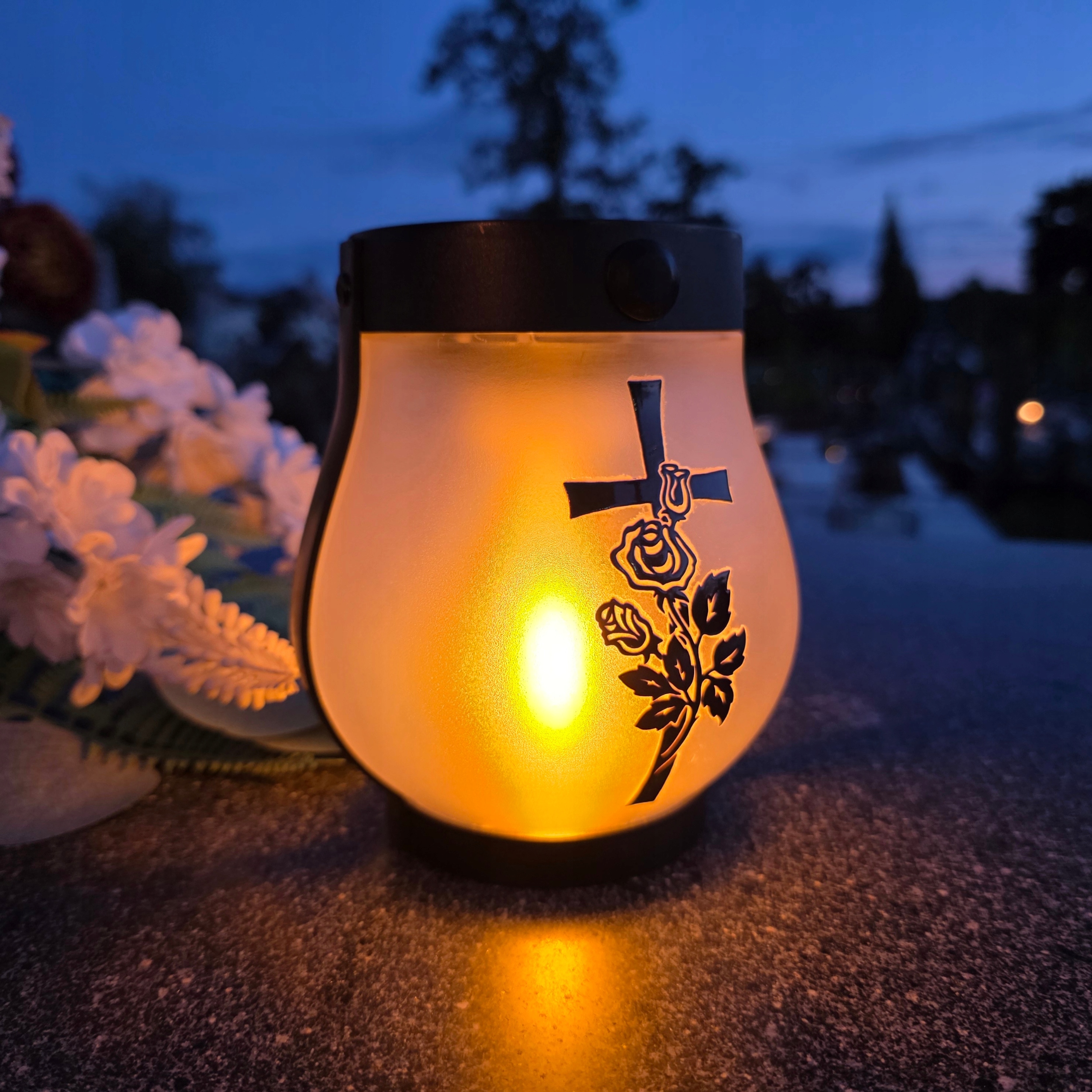 освещенный деликатным, теплым светом выглядит чрезвычайно достойным и заставляет надгробие принять исключительное очарование. Альтернатива обычным свечам.