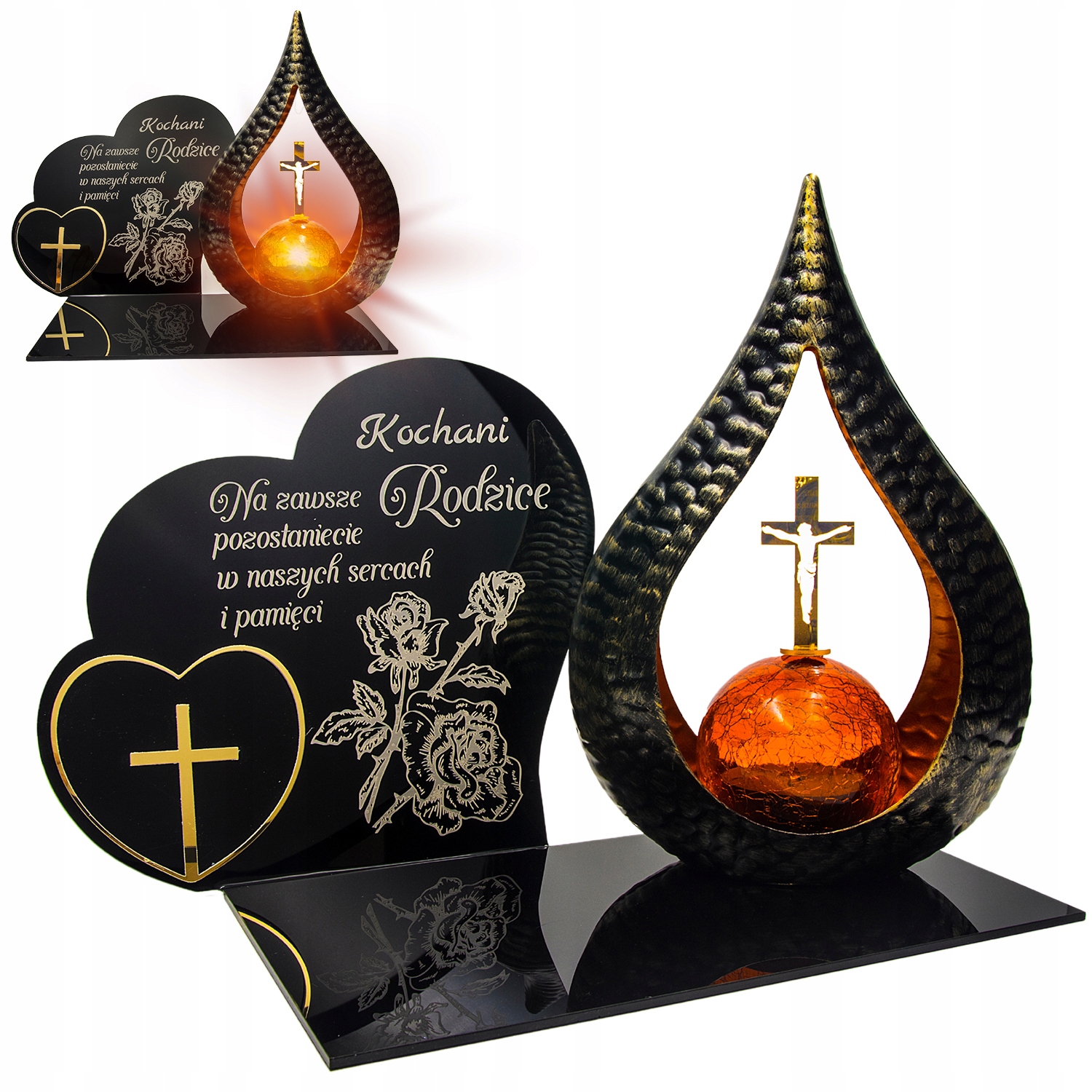 Элегантная светодиодная солнечная свеча для могилы с гравированным акриловым стеклом, украшенным золотым сердцем.