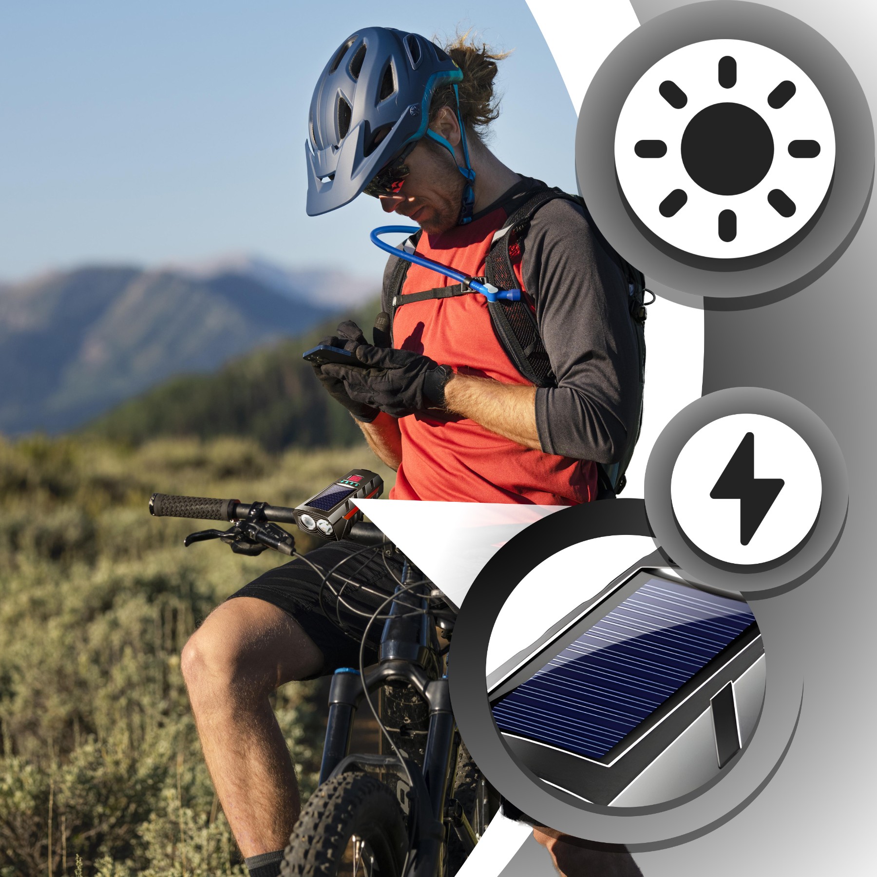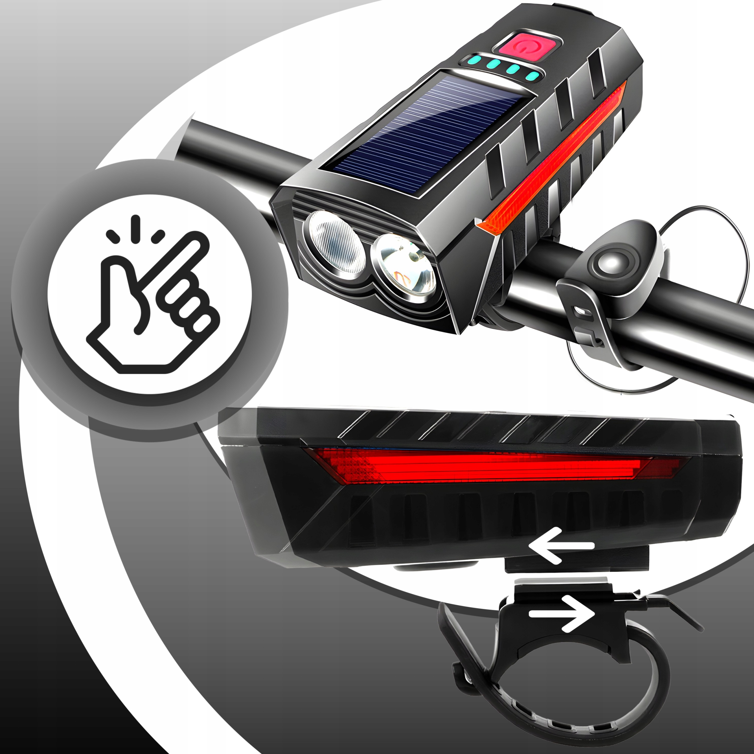✏️ Питание от солнечной батареи и USB ☀️ Встроенный громкий звуковой сигнал ✉️ Индикатор уровня заряда батареи ✔️ Водонепроницаемый IPX4 ♥️ Прочный корпус из АБС-пластика и металла ♣️ Яркий светодиодный фонарь спереди и сзади ♠️ Простая установка на руле ⭐ Идеально подходит для ночных поездок