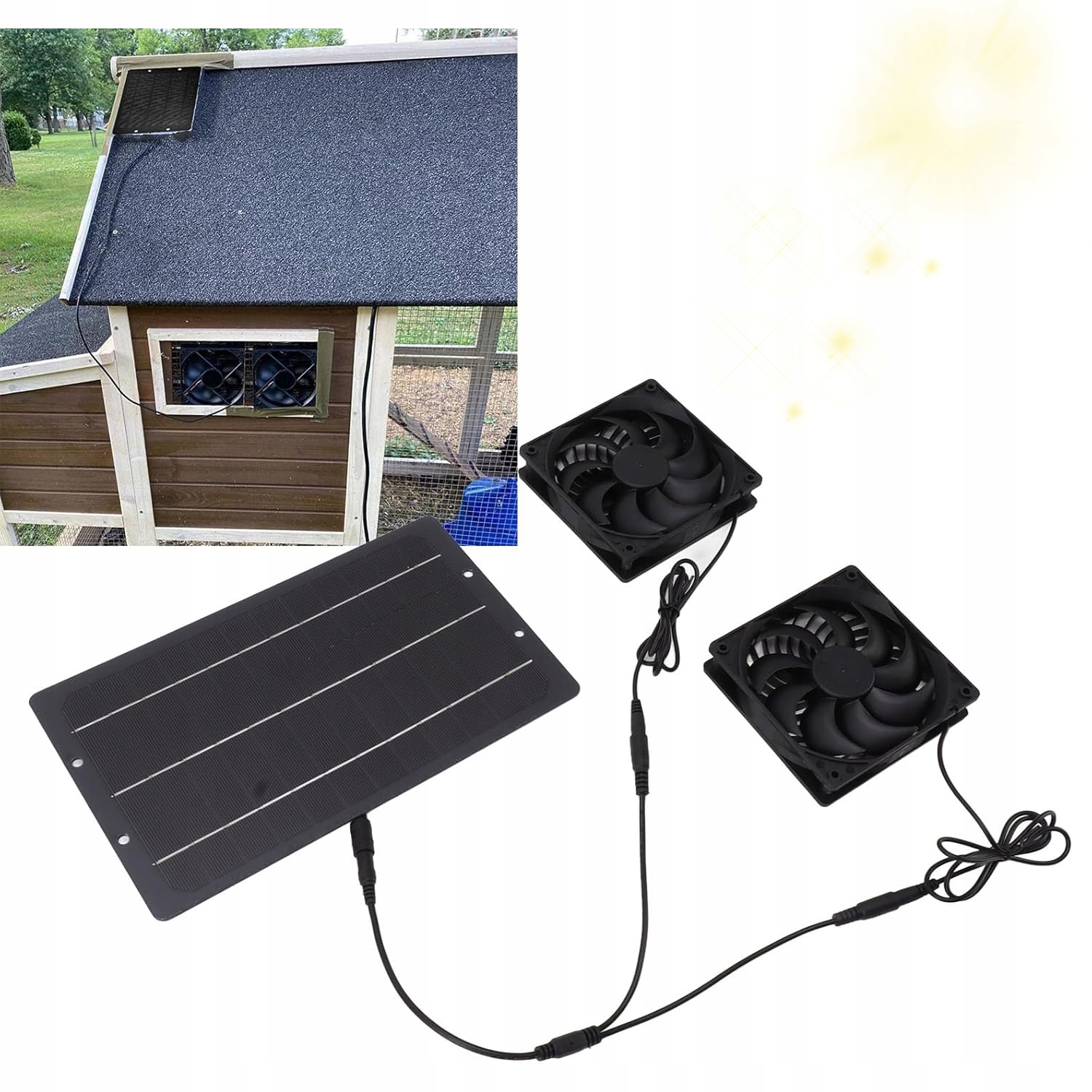 ✅ он может взорвать горячий воздух и вдыхать холод, эффективно снижая комнатную температуру и сохраняя свежий воздух. Просто подключите солнечную панель к вентилятору и положите ее на солнце. Панель SloNeczny I wdylator muszą być przymocowane do solidnej ściany lub dachu.