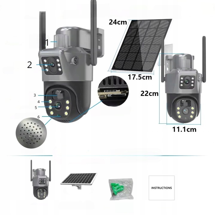 В комплект входят камера, солнечная панель, удлинительный кабель, крепежные винты и руководство пользователя на польском языке, что делает установку камеры быстрой и простой. Просто распакуйте, установите и готово!
