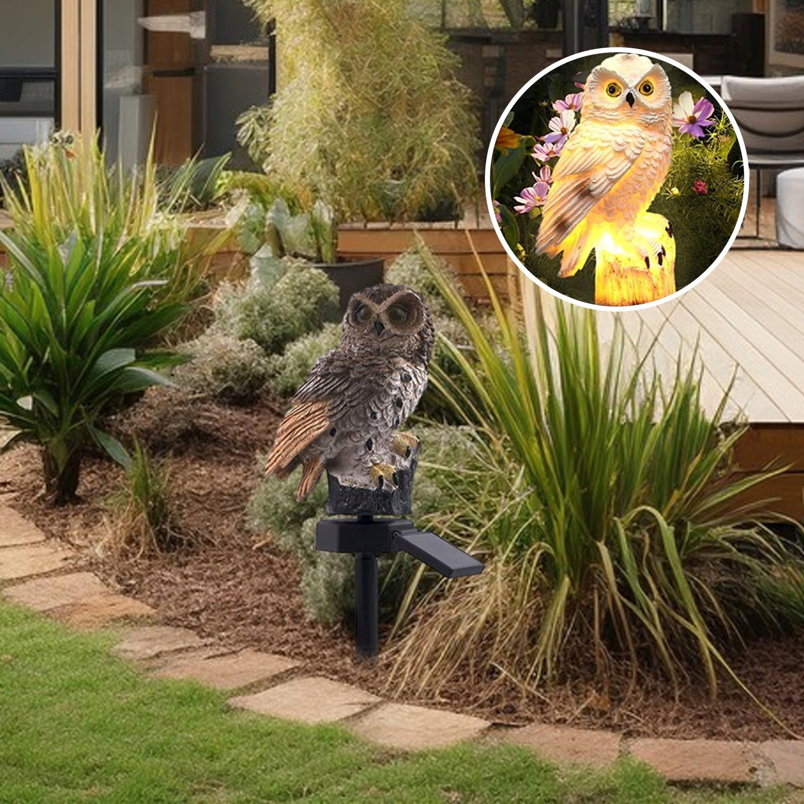 [Простота установки]: Солнечная лампа из смолы в виде совы с колышком проста в установке и обслуживании, просто вставьте ее в нужное место. место.