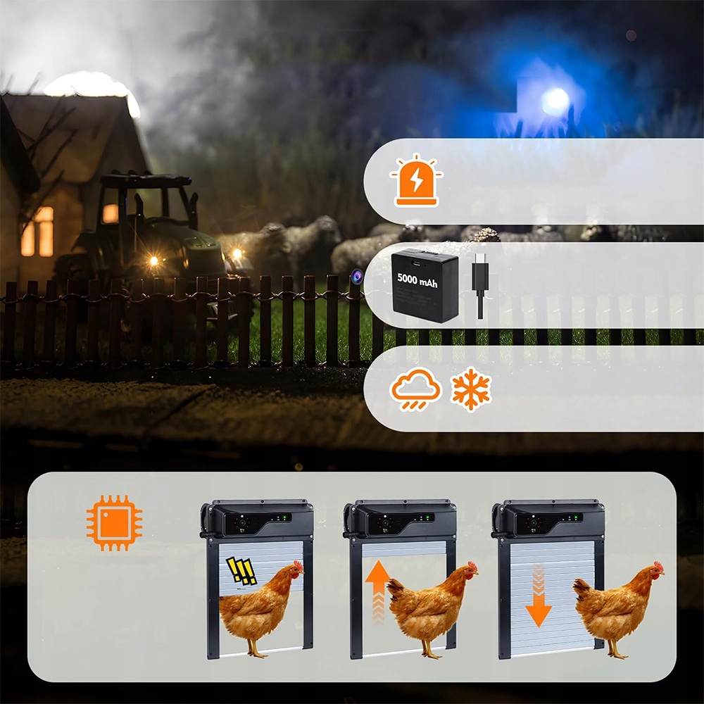 Автоматическая дверь курятника предлагает три режима питания: солнечная энергия, сетевой адаптер и встроенный аккумулятор емкостью 5000 мАч. Аккумулятор действует как надежный резервный источник питания, сохраняя достаточно энергии, чтобы дверь могла работать в различных условиях, не беспокоясь о погодных колебаниях. Это делает его идеальным выбором для домашнего курятника или удаленной птицефабрики.