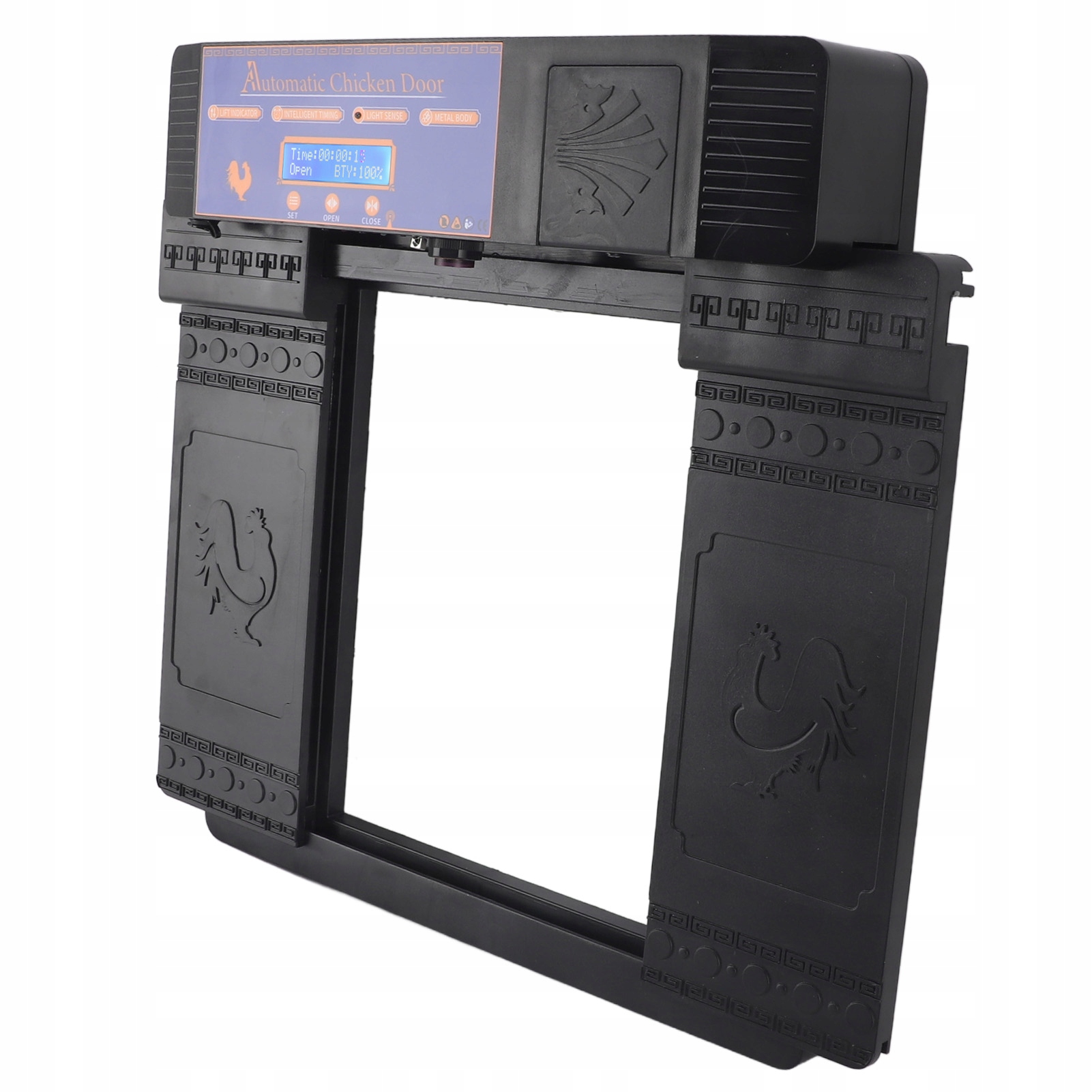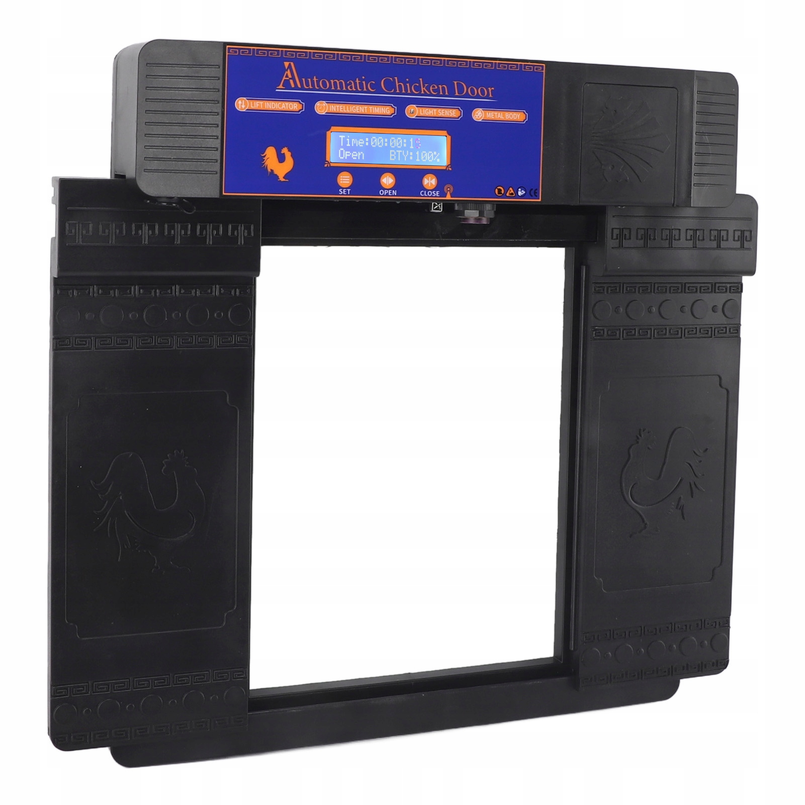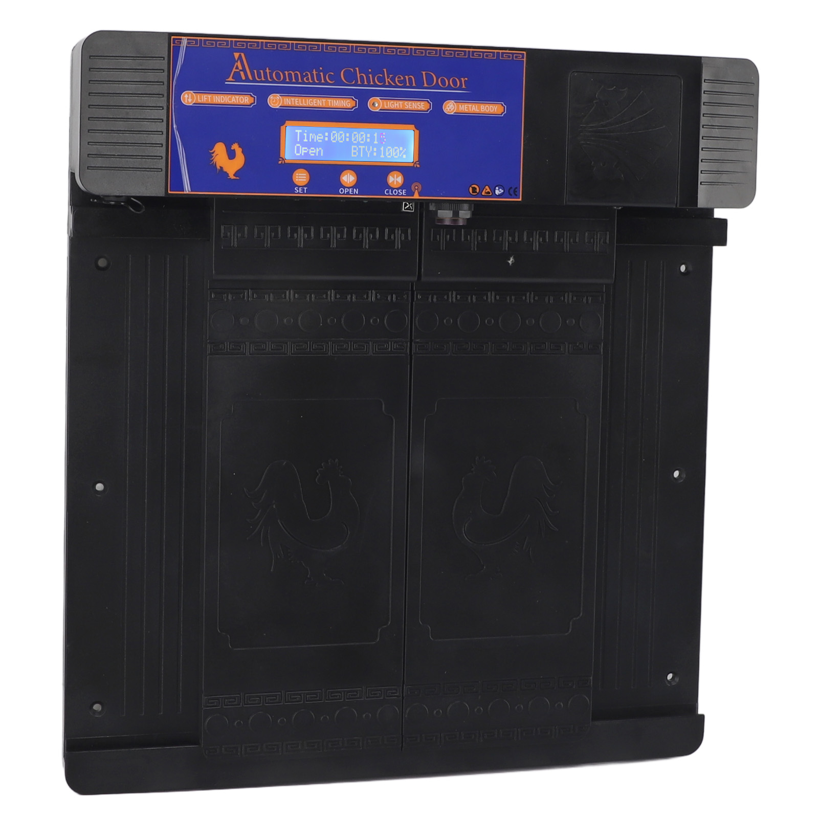 6. Светодиодный дисплей: Кроме того, дверь курятника оснащена светодиодным дисплеем высокого разрешения, в нижней части кнопки, чтобы сделать настройку времени четкой и простой, на дисплее вы можете четко видеть конкретное время открытия и закрытия двери курятника.
