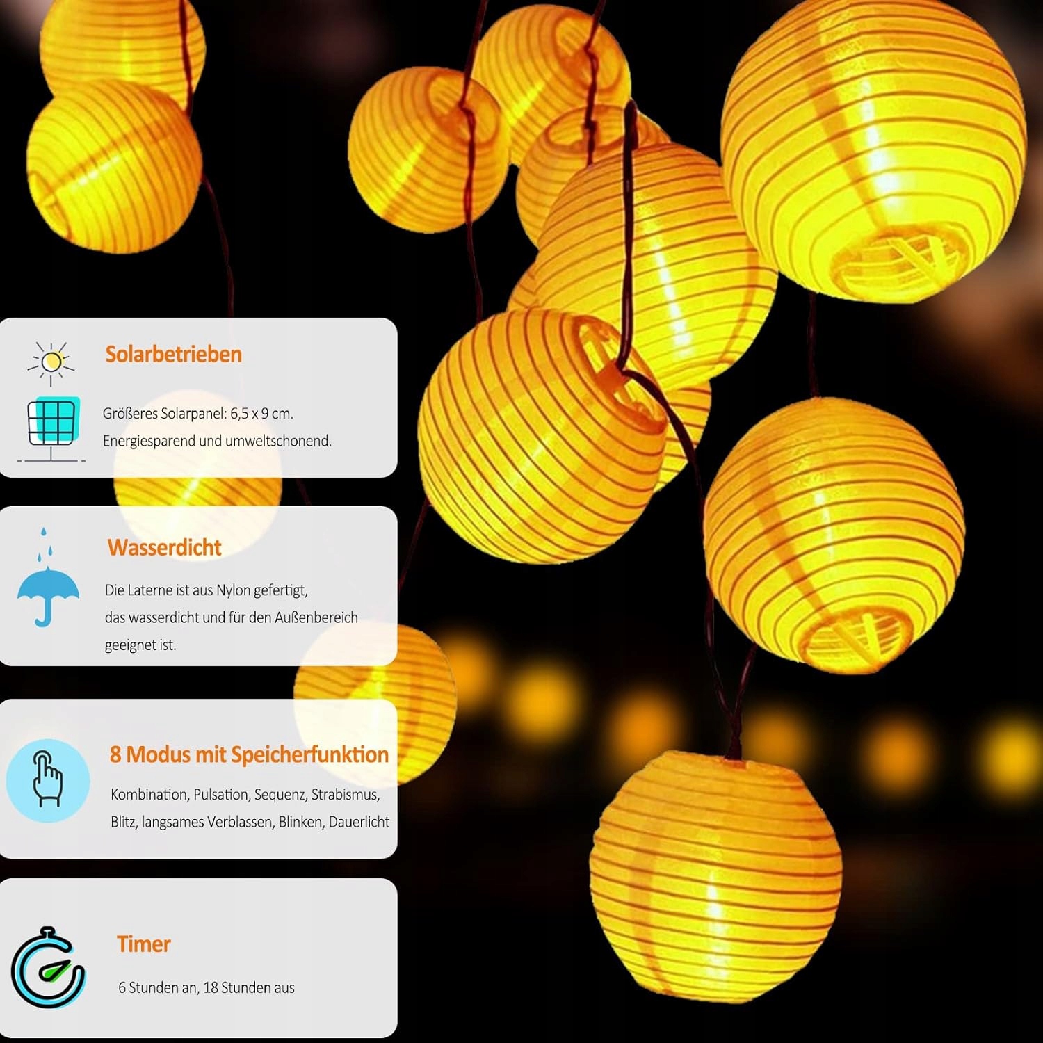 Стильные фонарики из прочного нейлона создают волшебную атмосферу – идеально подходят для сада, террасы, балкона или интерьера. Доступен в версии с теплым светом или красочной - для еще лучшего визуального эффекта.